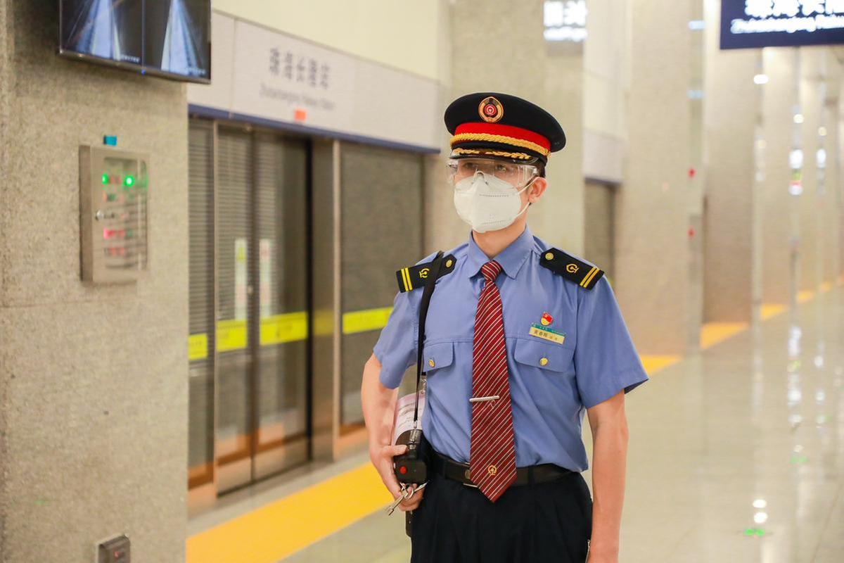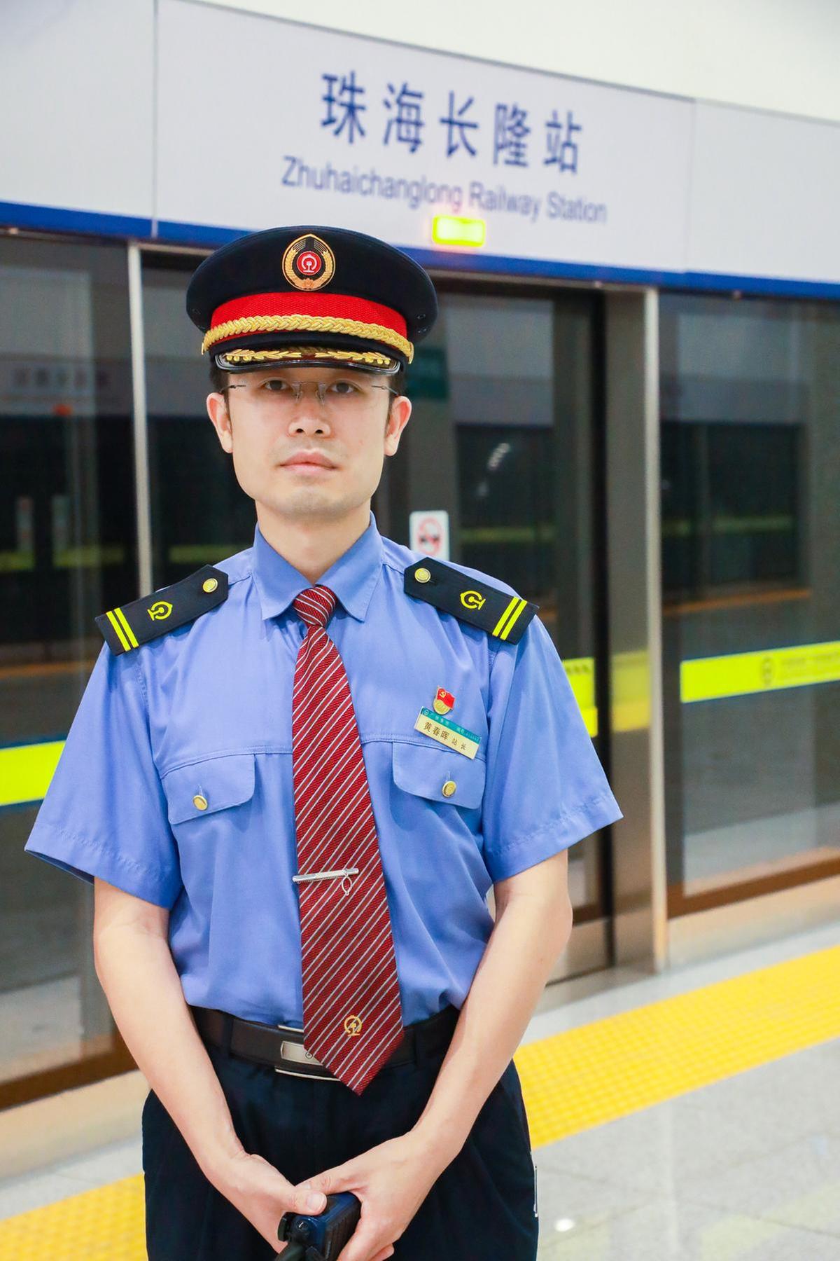 【黄春晖,广铁集团珠海长隆站站长。珠机城际一期最末端的车站,在疫情形势复杂的压力下,他带领党员先锋队攻坚克难,胸前的党员徽章代表着足下践行的宗旨。20日,因疫情防控需要,珠机城际暂停运营,他留守车站,随时准备奔赴防控一线为旅客服务。】