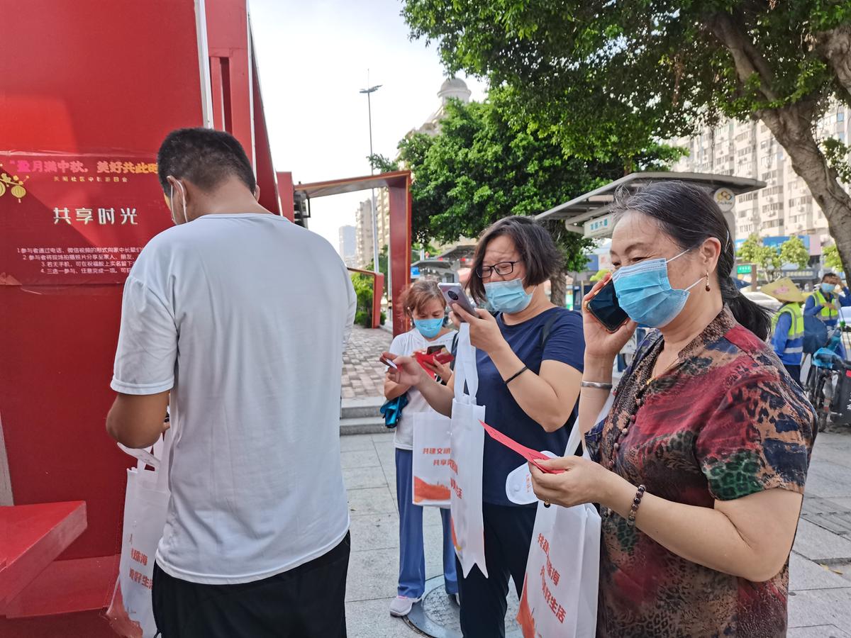 9月8日下午,拱北街道关闸社区新时代文明实践站联合澳门街坊会联合总会广东办事处组织开展“盈月满中秋,美好共此时”社区中秋游园会活动,活动在关闸社区“红色飘带”多功能休憩区举办,游园形式丰富多样,以弘扬传统文化为主旋律,有猜灯谜、制团扇、吟诗词、吃月饼、送祝福等喜闻乐见的活动,现场浓浓的节日氛围,吸引了上百位关闸社区珠澳街坊参加。