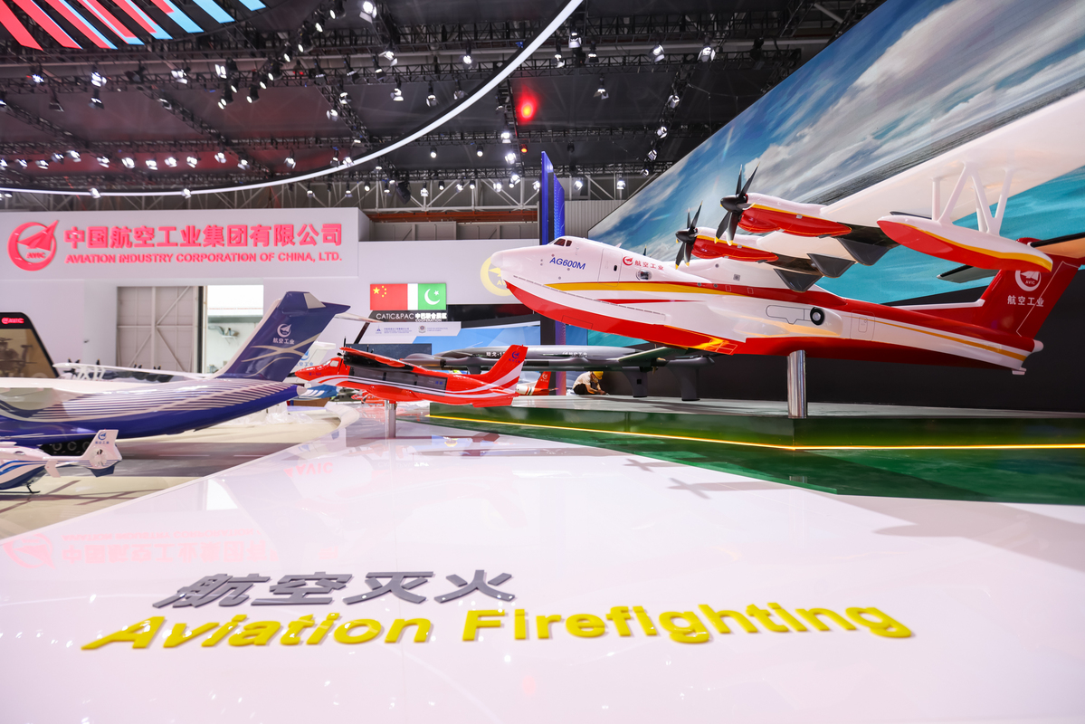 主展台四周,分布着制空作战、对面打击,海上攻防、支援保障、空中投送,训效体系、察打协同等分展区。其中,“珠海造”AG600“鲲龙”水陆两栖飞机模型摆放在紧邻主展台的支援保障分展区显著位置,在一众救援飞机中显得鹤立鸡群,本届航展,两架AG600M“鲲龙”全状态新构型灭火机将进行静态展示和投水演示,12吨水瞬间倾泻而下的壮观场面值得期待。