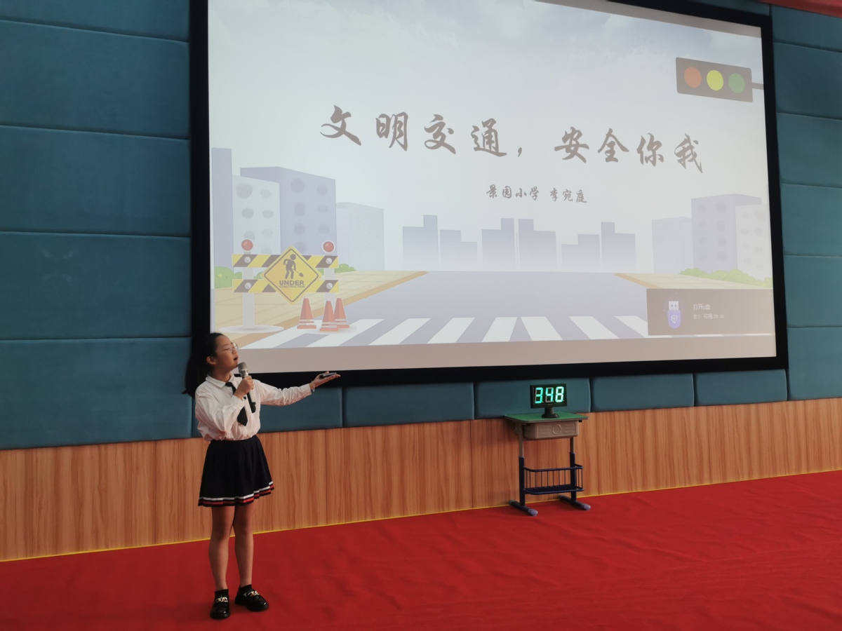 来自香洲区九州小学、北岭小学等8所小学的学生代表以现场抽签的方式依次登台演讲,大家围绕“校园交通安全”主题,以改编歌曲、童谣、儿歌、PPT演示等多元方式进行了精彩的演讲。