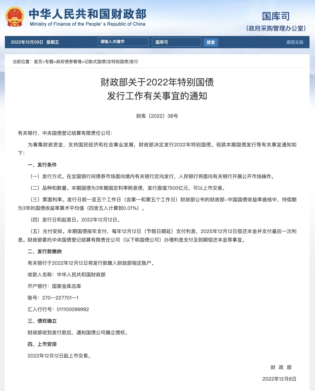 财政部发布通知,为筹集财政资金,支持国民经济和社会事业发展,财政部决定发行2022年特别国债。