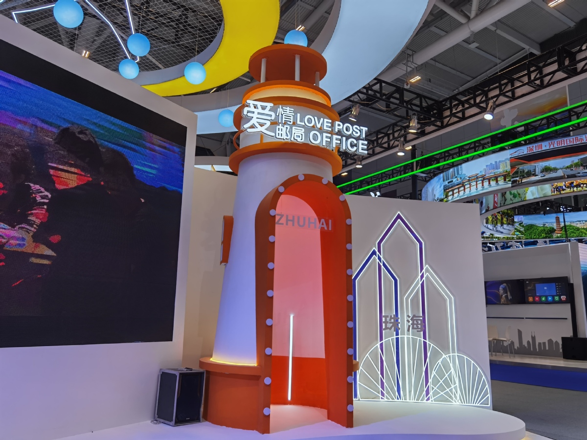 在舞台区,爱情邮局、珠海渔女、珠海大剧院等城市地标建筑被“搬”上了展台,观众站在印有沙滩和海浪元素的地毯上,仿佛置身珠海著名的情侣路,一览珠海城市特色剪影。同时,舞台区还设置了巨大的LED屏幕,通过循环播放珠海文化、城市宣传片,多维度展示珠海魅力。