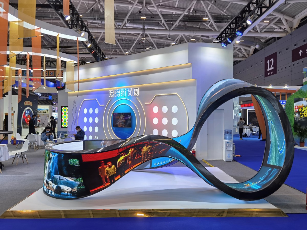 记者在现场看到,一条长长的LED显示屏蜿蜒成莫比乌斯环的形状,坐落在展台一角。屏幕上循环播放的宣传片,正倾力展示着珠海的城市形象与文化面貌。据了解,这是正方·情侣海岸项目的写意式呈现。