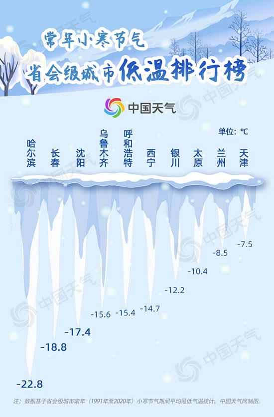 从中国天气网1991—2020年小寒节气省会级城市低温排行榜可以看出,上榜的均为北方城市,其中哈尔滨以-22.8℃位列榜首,长春和沈阳分别位居第二、第三。
