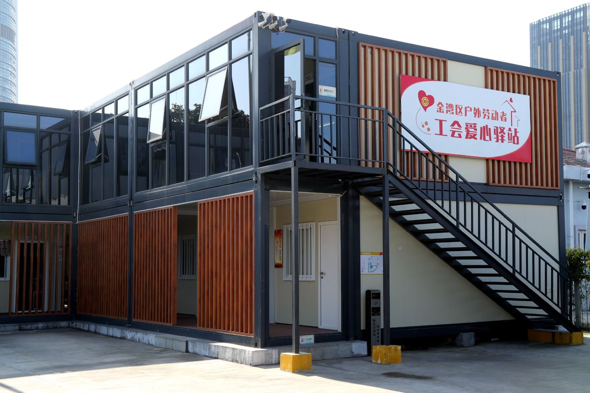 金湾区户外劳动者爱心驿站由金湾区委组织部、金湾区总工会共同建立,驿站内配备有卫生间、空调、电视、饮水机、微波炉、应急药箱、免费 WiFi、手机充电排插、电冰箱等各类设施,致力于打造成为环卫工人、快递小哥、交警等户外劳动者的温馨港湾,让他们在工作间隙,渴了有水喝,热了能乘凉,冷了能取暖。