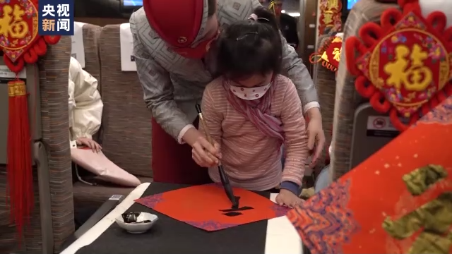 浓浓的年味还在回家的旅途中。在青岛开往北京南的G1066列车上,列车工作人员举行小年庆祝活动。活动现场,工作人员手把手教小朋友们写福字,和旅客一起做书签、品糖瓜,将年味传递给返乡旅客。