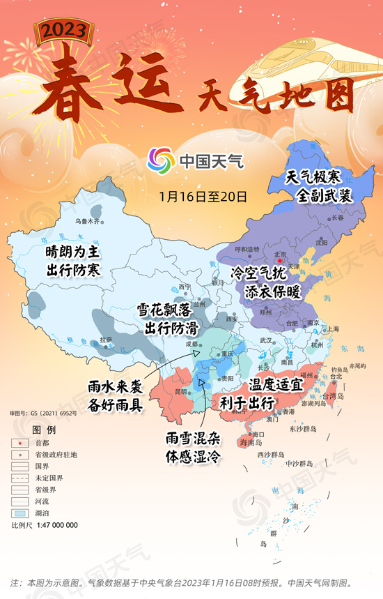 兔年春节进入倒计时,春运也将在本周迎来出行高峰。目前,今年首场寒潮天气过程已接近尾声,节前最后一周(1月16日至1月20日)是否还会有雨雪、降温天气来扰?春运路上如何做好防范?中国天气网推出最新2023春运天气地图,快来看本周春运路上的天气如何。