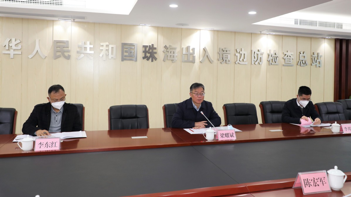在珠海出入境边防检查总站,总站长陈宏军向梁耀斌一行介绍了珠海边检总站2022年工作情况。2022年,珠海边检总站维护口岸安全稳定通关顺畅,年内查验出入境人员9700余万人次、交通工具350余万辆次,分别占全国85%、42%,在多起联合侦办案件中获重大战果;促进粤港澳深入融合发展,推动拱北口岸主厅改造、珠海机场口岸对外开放等重点口岸建设,促进口岸功能布局更加科学。为口岸安全稳定和珠海高速发展做出积极努力。