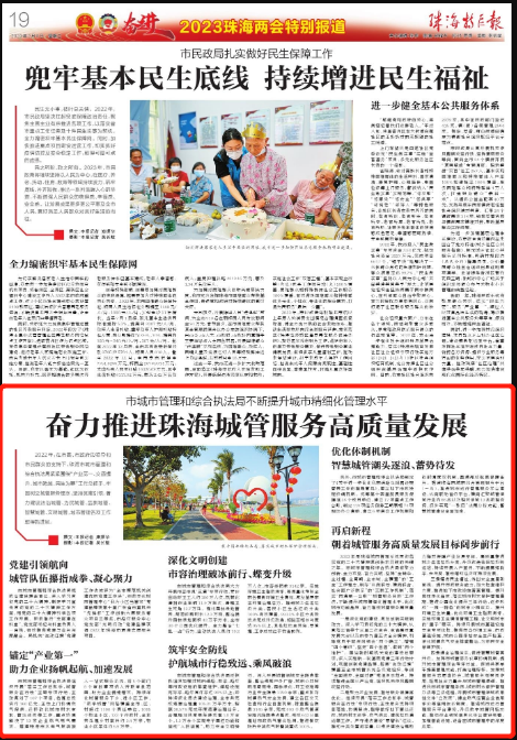 2023年是珠海城市管理系统贯彻落实党的二十大精神谋创新求突破的关键之年。市城市管理和综合执法局将聚力创新、全力攻坚、奋力突破,坚持“全链条、全过程、全周期、全市域、全覆盖”的“五全”工作理念,用好“纵向联动、横向联合、社会面广泛联系”的“三联工作机制”,落实“两清单一台账”“城管服务日历”工作法,不断提升城市精细化管理水平,优化城市功能品质,奋力推动城管服务高质量发展。