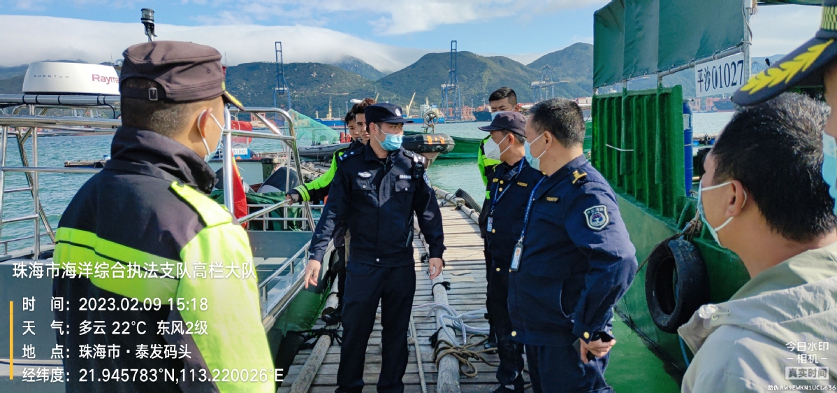 2月7日下午,高栏大队组织执法人员驾驶执法艇开展日常巡查,于17时20分在十字沥对开海域发现一艘无船名标识的木质船,船上两人未穿救生衣,也无法提供船舶相关证书。执法人员现场对当事人进行安全生产教育和相关法律法规宣传,随后将船舶移交公务仓保管作进一步处理。2月9日下午,高栏大队联合市公安局高栏港分局打私大队和南水、平沙两镇农办在辖区开展执法巡查,于15时在大突堤21号鱼栏码头检查3艘生计船。经核实,其中2艘涉嫌假牌套牌,执法人员将其吊运至保管场作进一步调查。