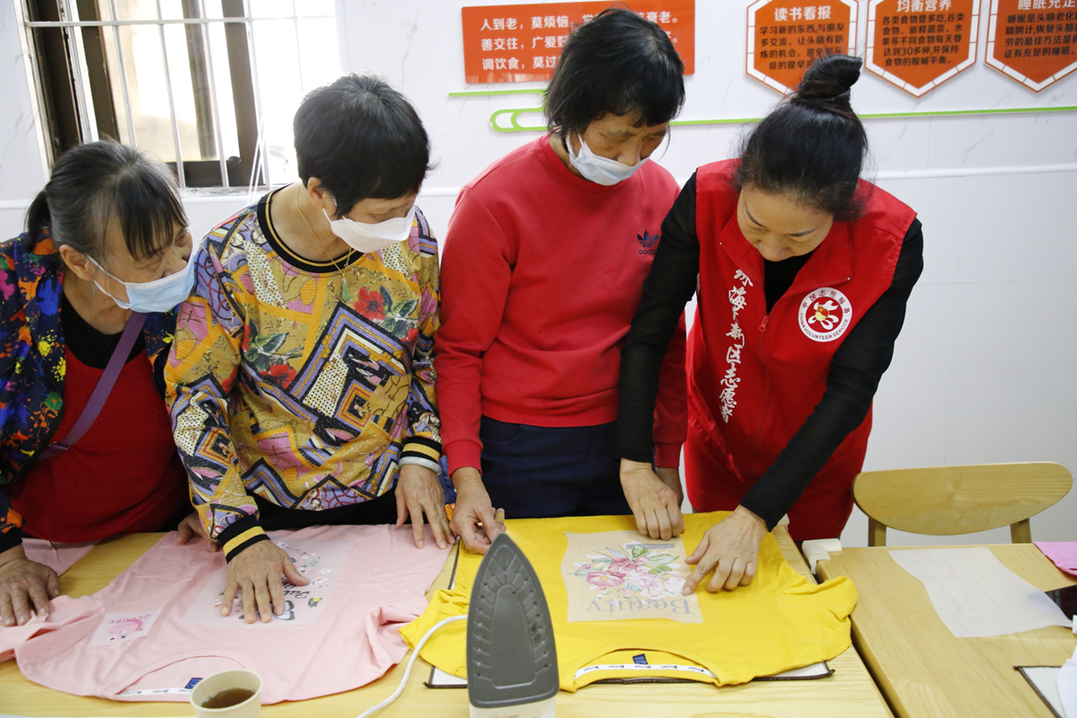 拿到材料后,长者们迫不及待地开始进行创作,将烫画素材在一件件T恤上进行排版设计精心点缀,以制作出自己的专属T恤。有的长者还和其他老伙计一起研究如何搭配更好,现场气氛热烈。