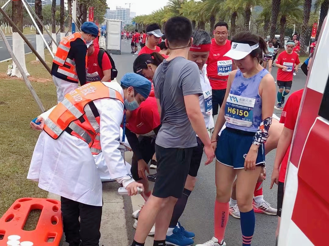 “沿途每一个医疗站、救护车,都配备了AED,全程守护每一位挑战自我的勇士。”据现场医疗保障组负责人介绍,医护人员现场共救助437名参赛者,主要病症是肌肉酸痛、扭伤、抽筋、摔倒导致的擦伤等轻症,有2名参赛者送医院治疗,其中1人是心悸(有甲亢病史),1人是低氧血症,无重症病例。