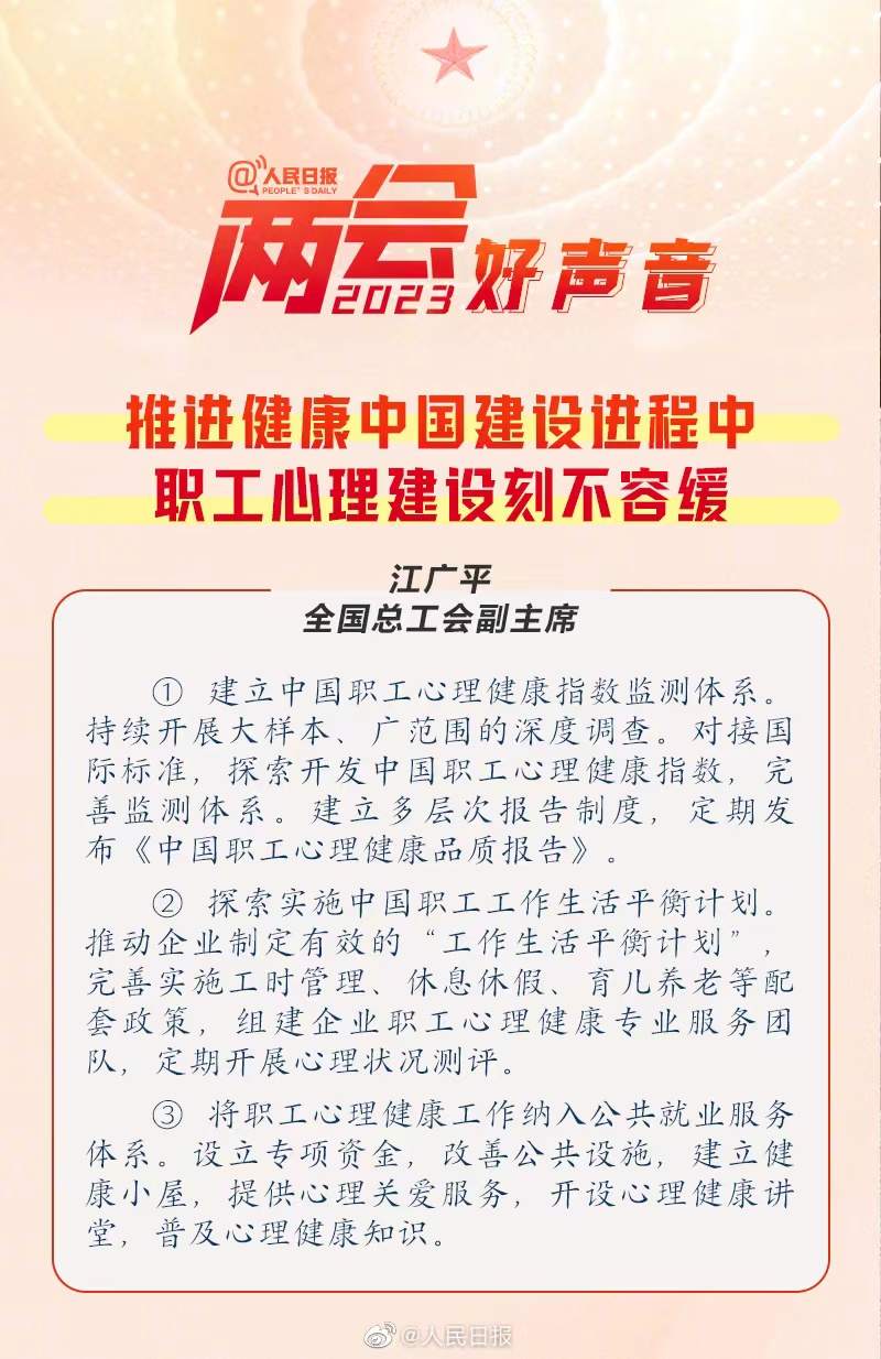 职场焦虑成为比较普遍的社会心理现象。建议探索开发中国职工心理健康指数,完善监测体系,定期发布《中国职工心理健康品质报告》;推动企业制定有效的“工作生活平衡计划”,组建企业职工心理健康专业服务团队,定期开展心理状况测评;将职工心理健康工作纳入公共就业服务体系,设立专项资金,提供心理关爱服务。