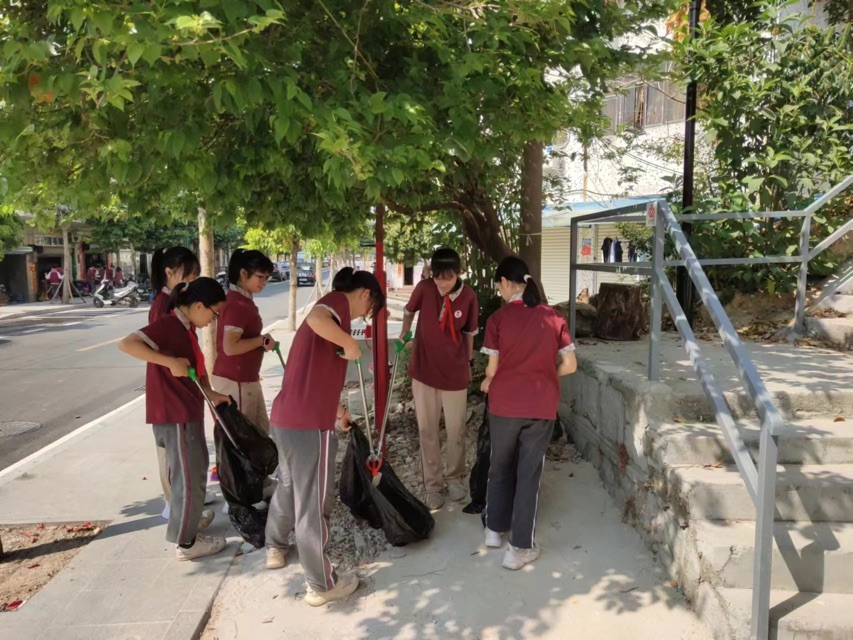 桂山小学的学生们手拿垃圾袋、垃圾钳,在桂山岛景区内仔细检查环境卫生,沿途将地面上的纸巾、烟头等垃圾捡拾进携带的垃圾袋内。