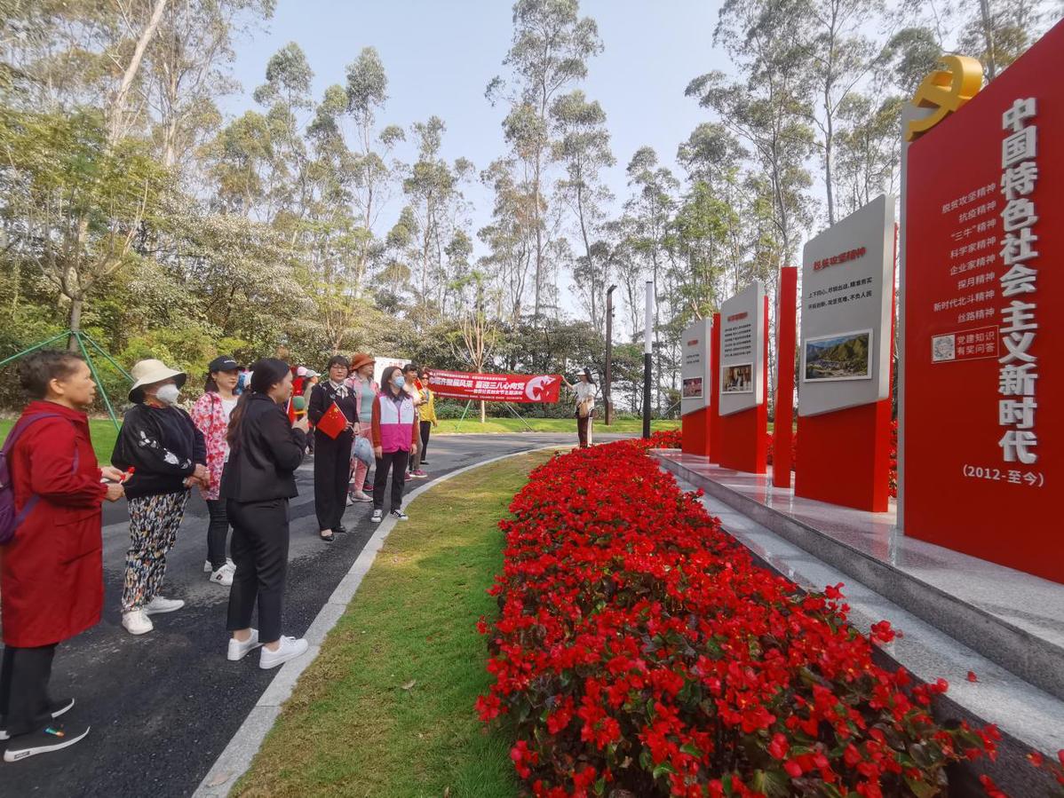 唱支山歌给党听,我把党来比母亲……在社工的带领下,社区妇女们哼着动听的红歌、迈着轻快的脚步漫步在红花山党建公园。公园内多个主题红色空间分别讲述了自新民主主义革命时期、社会主义革命和建设时期、改革开放和社会主义现代化建设新时期到中国特色社会主义新时代以来4个重大历史时期伟大的建党精神,生动展现了中国共产党的百年奋斗史、实践史。女同胞们沿登山步道而行,畅游红色文化线路,边逛公园边学党史、体验红色文化、廉洁文化。