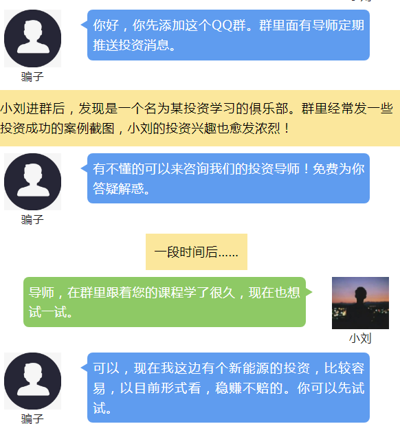 近日,家住香洲区的小刘,偶然在网络上看到一篇投资解说文章,觉得分析得不错,对其中提到的投资也有些兴趣,于是就私信了这个链接里的“导师”,想学习相关知识。当小刘加上“导师”后,对方要求小刘先添加一个QQ群,群里面有“导师”定期推送投资消息。小刘进群后,发现是一个名为某投资学习的俱乐部。群里经常发一些投资成功的案例截图,很多人讨论投资某项目赚了钱,在大家的撩拨下,小刘的投资兴趣也愈发浓厚。