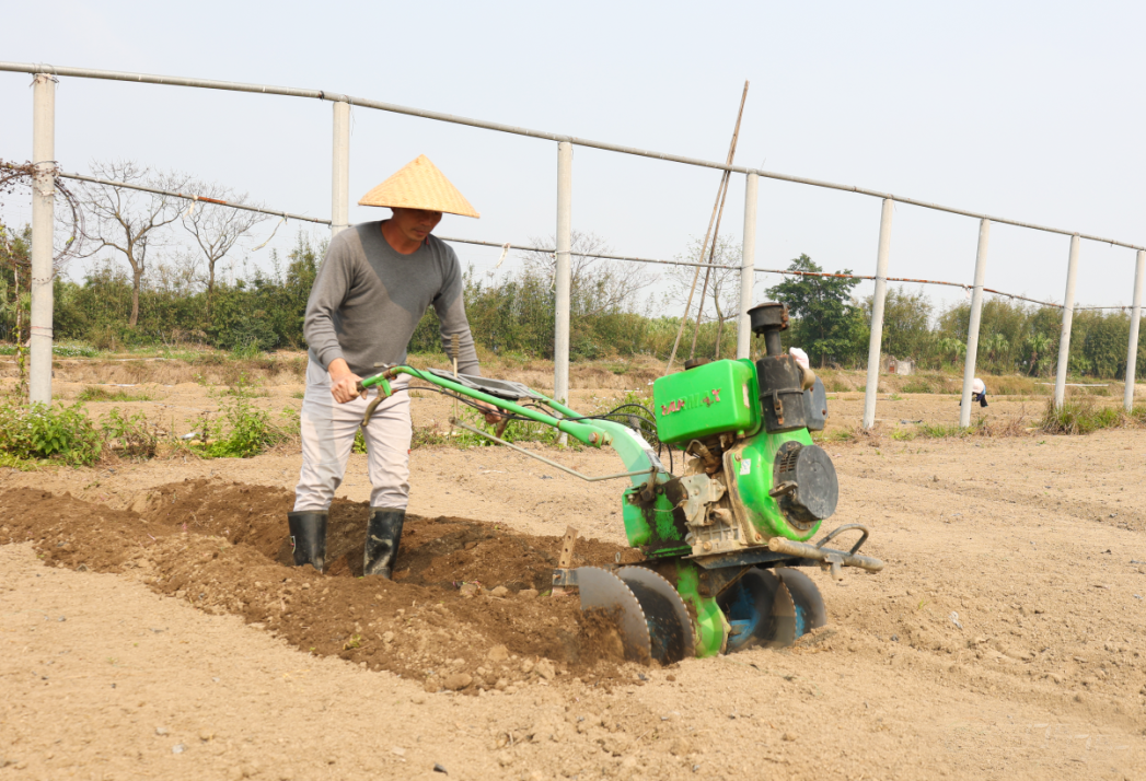 随着机器声轰鸣,新鲜的泥土翻滚上来。在斗门镇小濠冲村濠泉蔬菜种植基地,农户梁北泉正熟练地操作旋耕机,对地块进行翻耕。在整好的田地里,工人们正在将育好的南瓜苗移种在田垄上,种下新一年丰收希望。