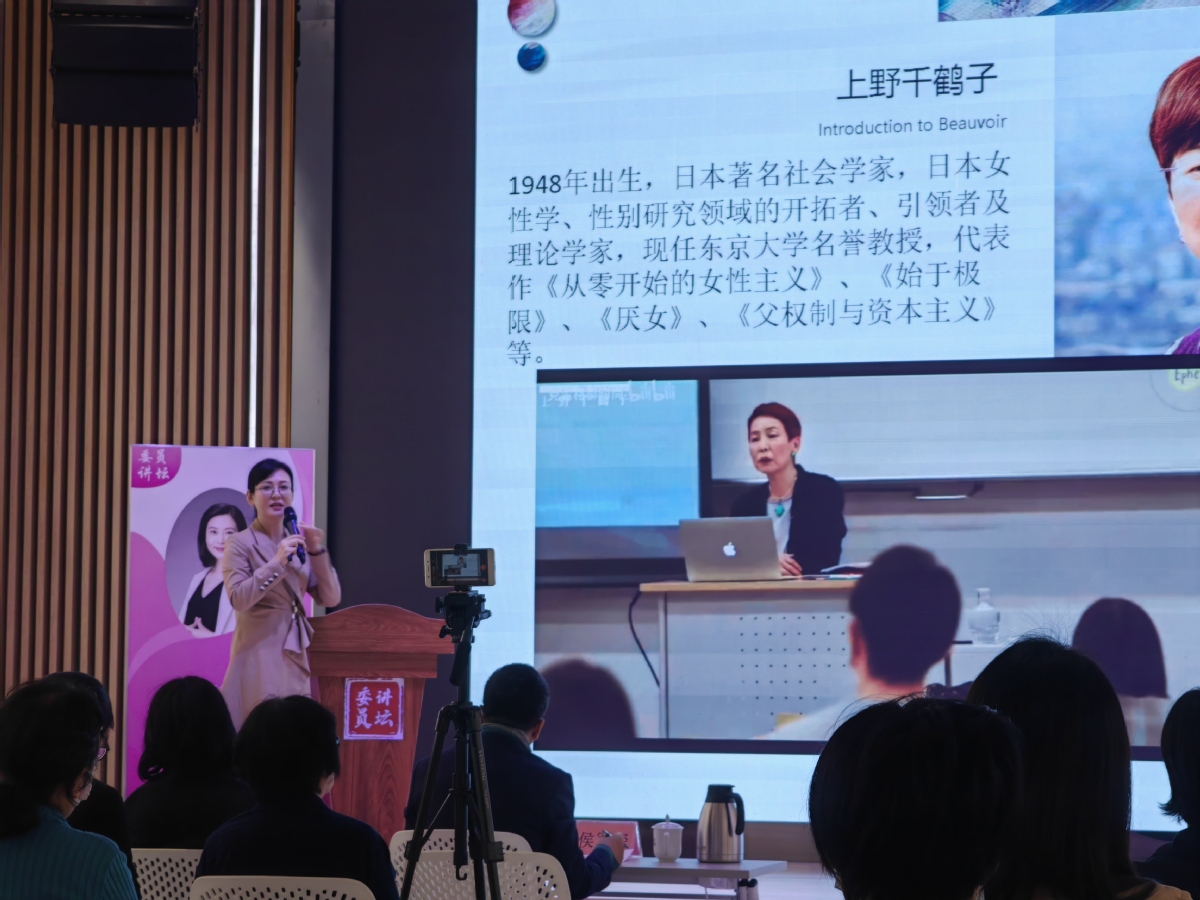 程因则以“女性从独立走向自由”为题,科普了女性主义思潮相关内容,介绍了西蒙娜·德·波伏娃和上野千鹤子两位女性主义作家,分享了自己的工作历程和实践感悟。“要做独立女性,并努力做女性先锋。”程因呼吁,每个女生要珍视自我价值,学会自立自强,鼓励女性跳出传统的性别设定,追求自由的思想,不断发展自己,拓展生命的宽度和内涵。