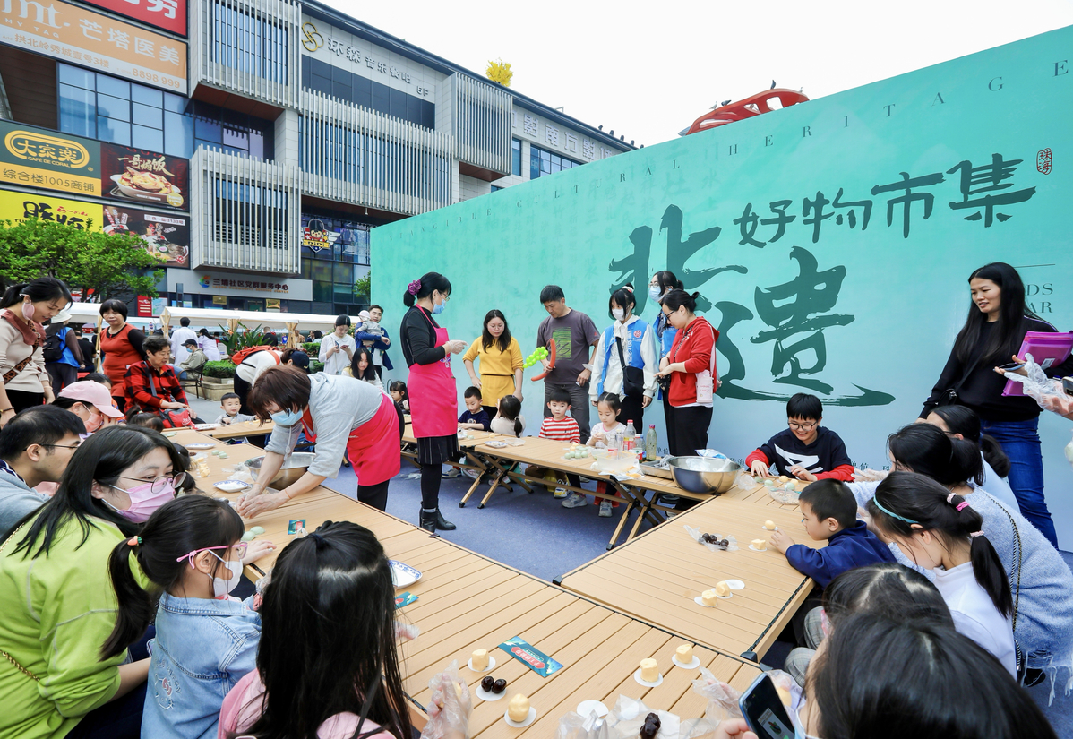 记者在活动现场看到,在市集摊位区域,非遗传承人化身文化传播大使,热情地为市民朋友现场展示非遗项目,讲解非遗知识。在手工作坊互动区,定家湾茶果非遗传承人吴如珠邀请市民体验定家湾茶果制作,现场制作艾叶糍、南瓜糍,让市民们有更好的逛集体验,增加游玩的互动感与体验感。