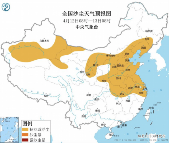 中央气象台预计,受冷空气影响,12日至15日,内蒙古、华北、东北地区、黄淮、江淮等地多大风天气,风力一般有4~6级,阵风7~9级,部分地区并伴有沙尘天气。其中,4月12日8时至13日8时,新疆南疆盆地和东部、内蒙古中西部、甘肃河西和中部、宁夏、陕西中部、山西、河北、辽宁、北京、天津、山东、河南、安徽、江苏、上海、湖北中北部、浙江北部等地的部分地区有扬沙或浮尘天气。中央气象台4月12日6时继续发布沙尘暴蓝色预警。