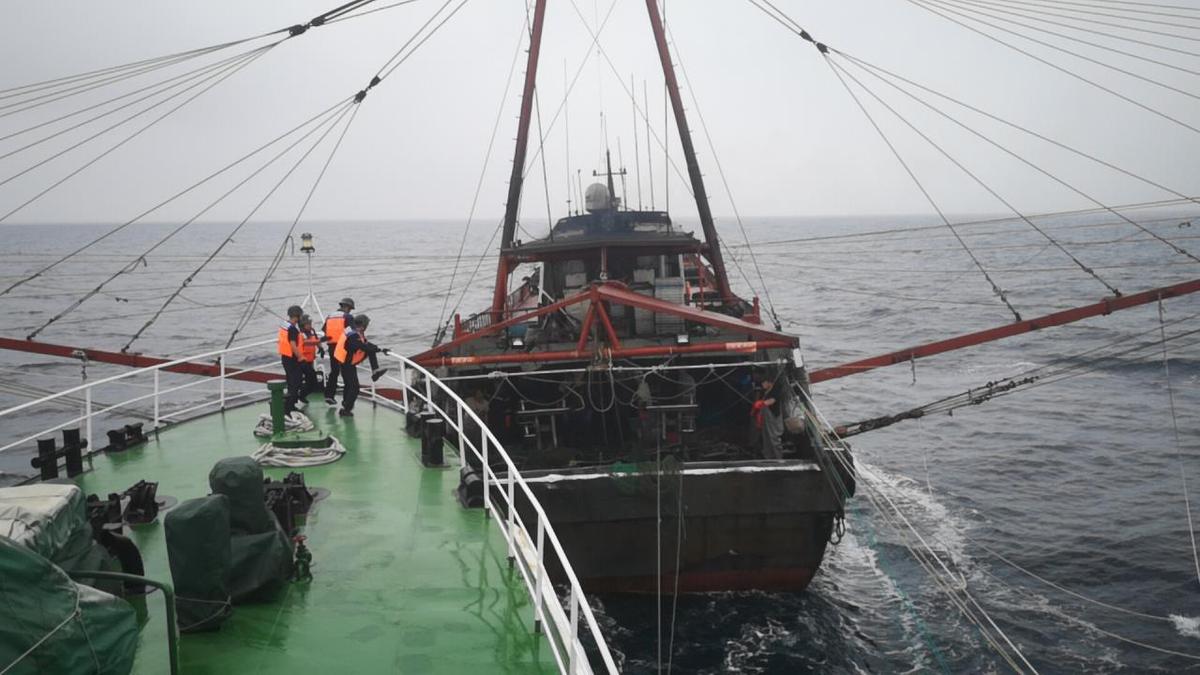 24日早上,中国渔政44183船在万山岛附近海域巡航时,通过渔船监控及AIS系统,发现细担岛东面海域有渔船航迹可疑,根据经验推断极有可能是电鱼船。为了避免打草惊蛇,确保执法效果,10时许,执法人员驾船从万山岛附近海域直奔庙湾岛以东海域,再迂回沿东北方向航行,在担杆尾水域成功截获该船,该船已拆掉船名号,涉嫌正在进行非法电鱼作业。面对突然到来的执法船,船上人员慌忙收拾渔网电线,拒不停船接受检查。逃逸期间,船上人员砍断作案电线,并将渔获物及电鱼工具丢下海,企图毁灭证据。中国渔政44183船船长凭借丰富的驾驶经验,利用电鱼船收网时速度不快的时机,成功靠帮电鱼船尾,执法人员于13时18分成功登上并控制作案船舶,于18时05分押送至桂山岛作进一步调查处理。