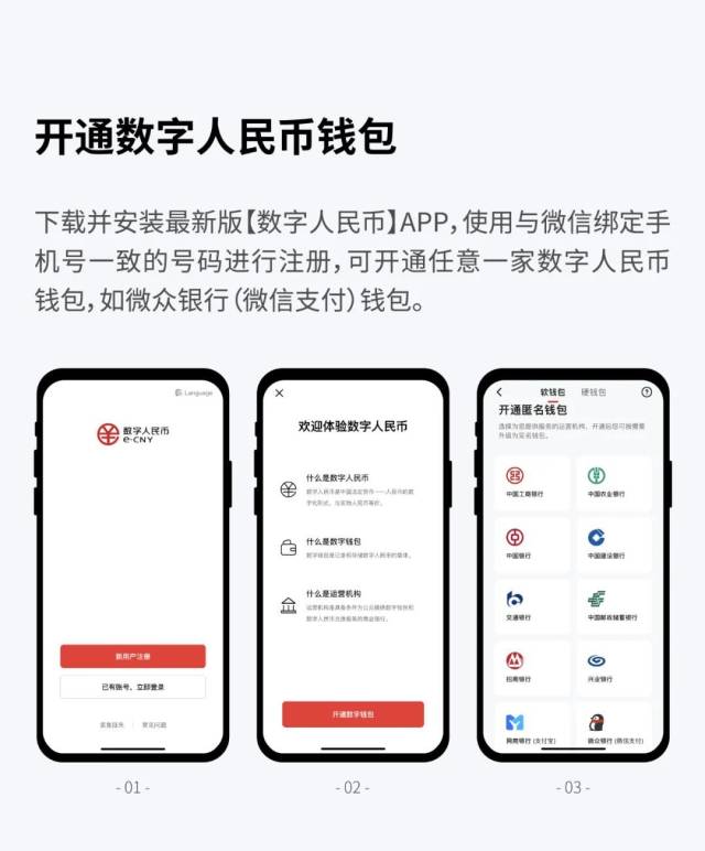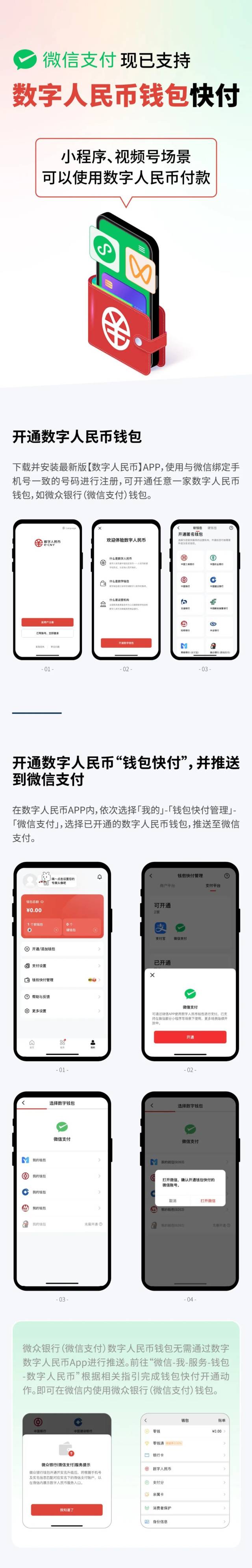 即日起,微信用户可以在数字人民币APP内的钱包快付功能下开通“微信支付”,选择将任意运营机构——如微众银行(微信支付)——的钱包推送到微信支付,就可在视频号、小程序场景内支持数字人民币的商家中使用数字人民币进行交易。