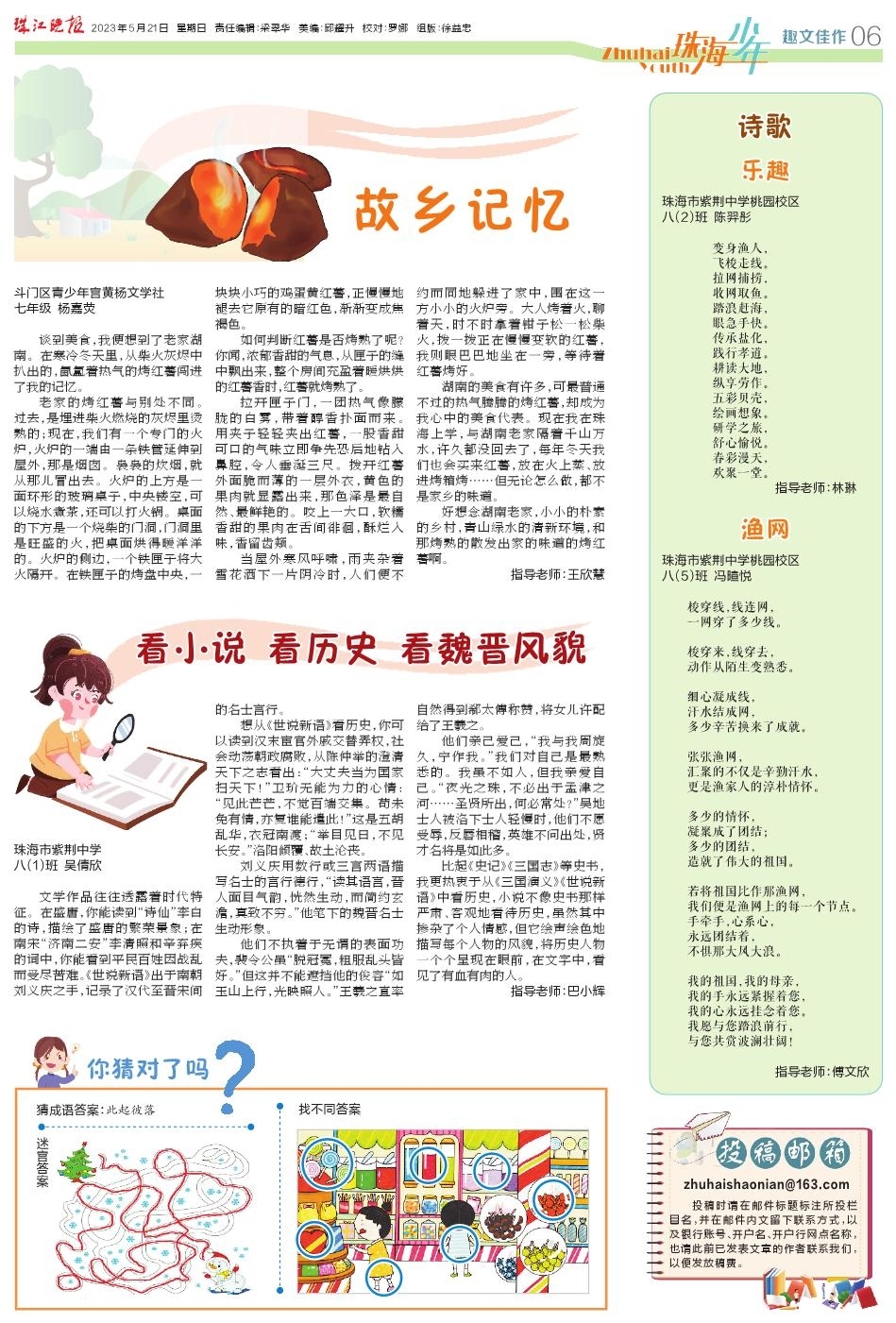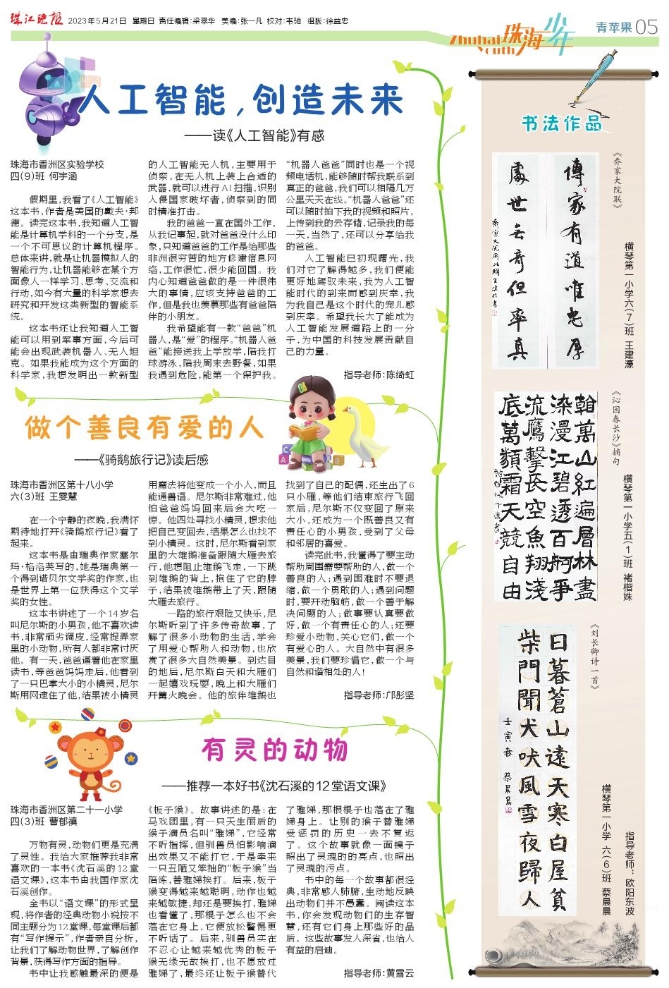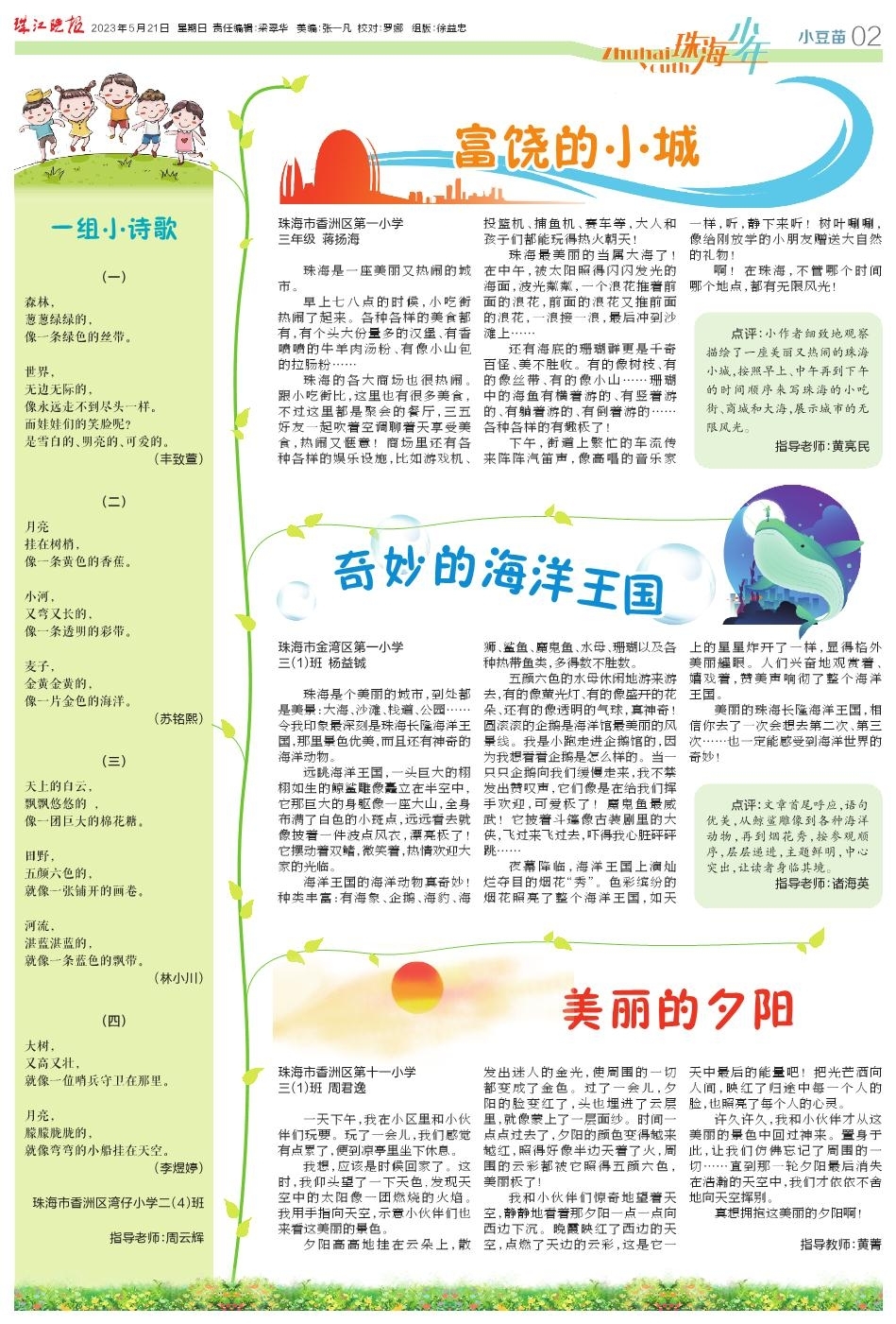 《珠海少年》是一份以孩子视角看世界的新闻纸,让小读者变身小记者;这里有一片让孩子爱上写作的文学天地;这里还是一个活跃思维、展示才艺的共乐园。《珠海少年》每周在珠江晚报出版,每期刊发8个版。