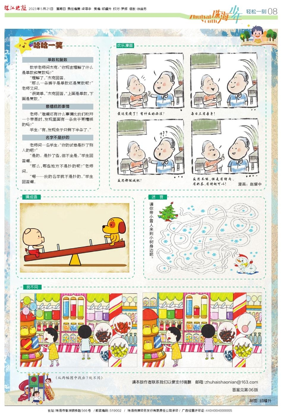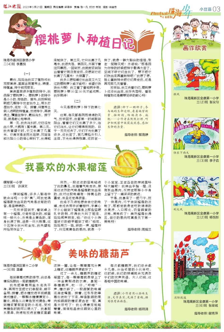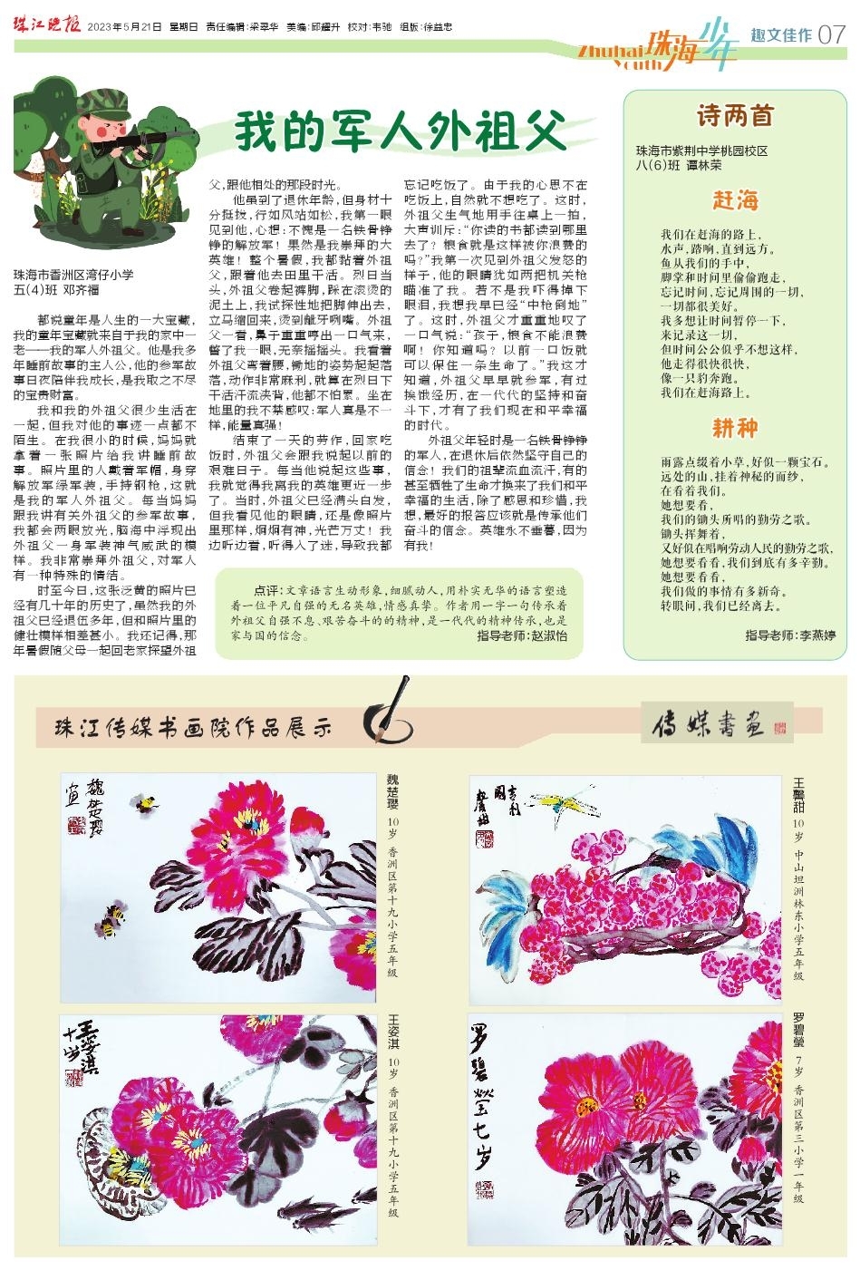 《珠海少年》是一份以孩子视角看世界的新闻纸,让小读者变身小记者;这里有一片让孩子爱上写作的文学天地;这里还是一个活跃思维、展示才艺的共乐园。《珠海少年》每周在珠江晚报出版,每期刊发8个版。