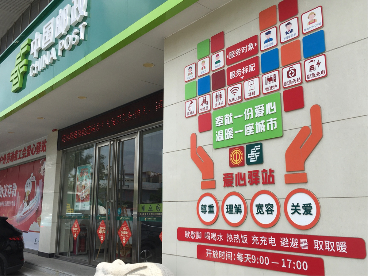 位于香洲前山邮政支局的爱心驿站是市总工会依托珠海邮政分公司网点资源建设的公益服务场所之一,运行近两年来这里的工作人员一直用心接侍每一个有需要的人。“大多数服务标识、指引牌还是原来的样子,服务事项也变化不大,针对高温和接下来的多雨天气我们对服务作了必要调整。”在22日采访中,该网点负责人说。