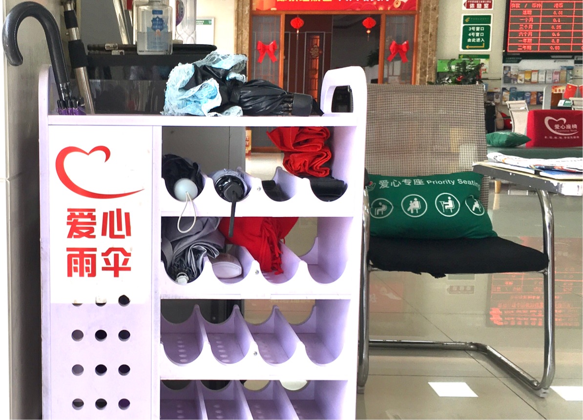 和过去不同,这里在保安员门卫处加设了专门的“爱心雨伞”取用(存放)柜,有需要的市民群众或户外劳动者不仅可以拿走伞具,也可以存放提供雨具,过程无监管,全靠自觉。从近期投用情况看,柜内没有空过。