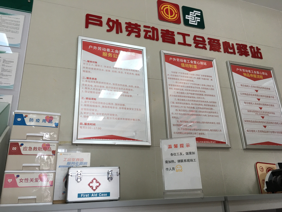 另一个变化是场内加热食材的电器被撤走。工作人员说,主要出于卫生安全和空间利用的考虑,天热了几乎没有热饭需求,处理不当食物还会变馊。本来可以一撤了之,后来担心汛期极端天气下户外工友可能真有带饭加热的需要,于是保留了热饭告知牌,提醒工友可找营业员帮忙,到网点职工自用场所热饭。此外,来这里还能免费喝水、给手机充电、吹空调歇脚、取用应急药物与设施,公益服务驿站该有的这里基本都有。“总之,希望大家在有困难时不要有顾虑,能大大方方进驿站。”