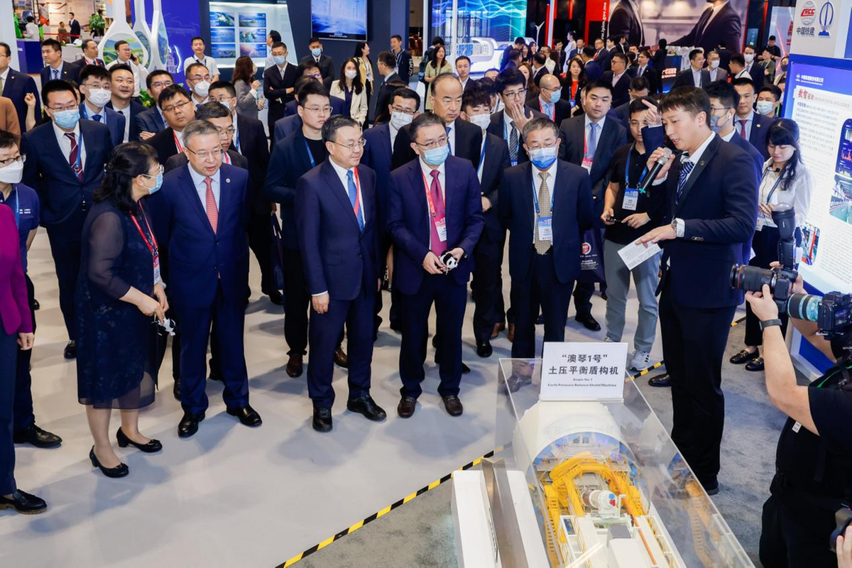 中国土木工程集团有限公司相关工作人员向巡展嘉宾介绍“澳琴1号”土压平衡盾构机。