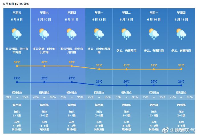 珠海市气象台发布消息,预计今晚到明天,珠海多云到晴,间中有雷阵雨,气温27到32℃,相对湿度70%到95%,吹和缓偏南风。