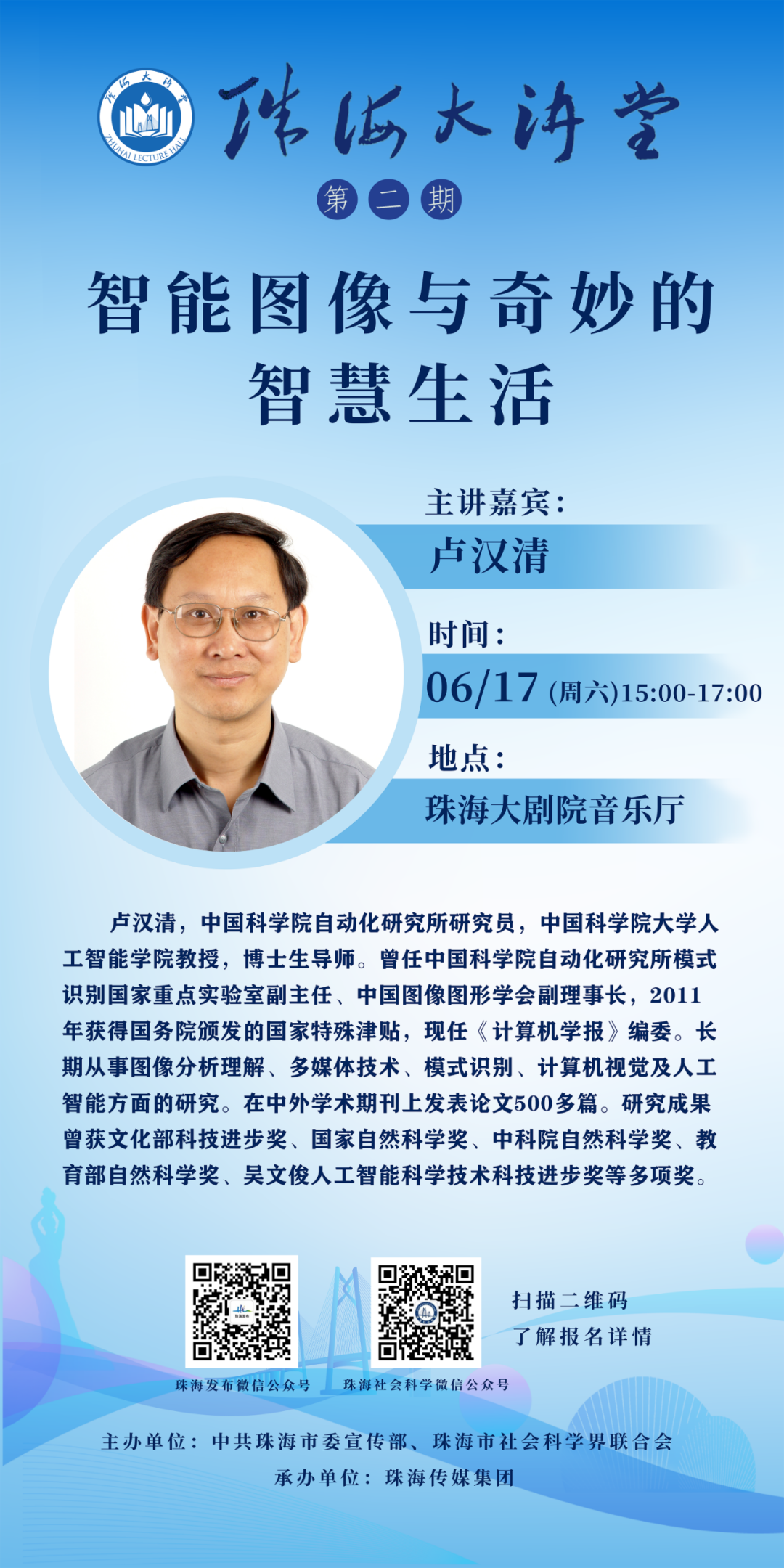 6月17日,中科院“大咖”卢汉清将做客第二期珠海大讲堂,以“智能图像与奇妙的智慧生活”为主题,介绍前沿的科学理论,带领大家探索智能图像的奥秘,感受科技发展的蓬勃力量。