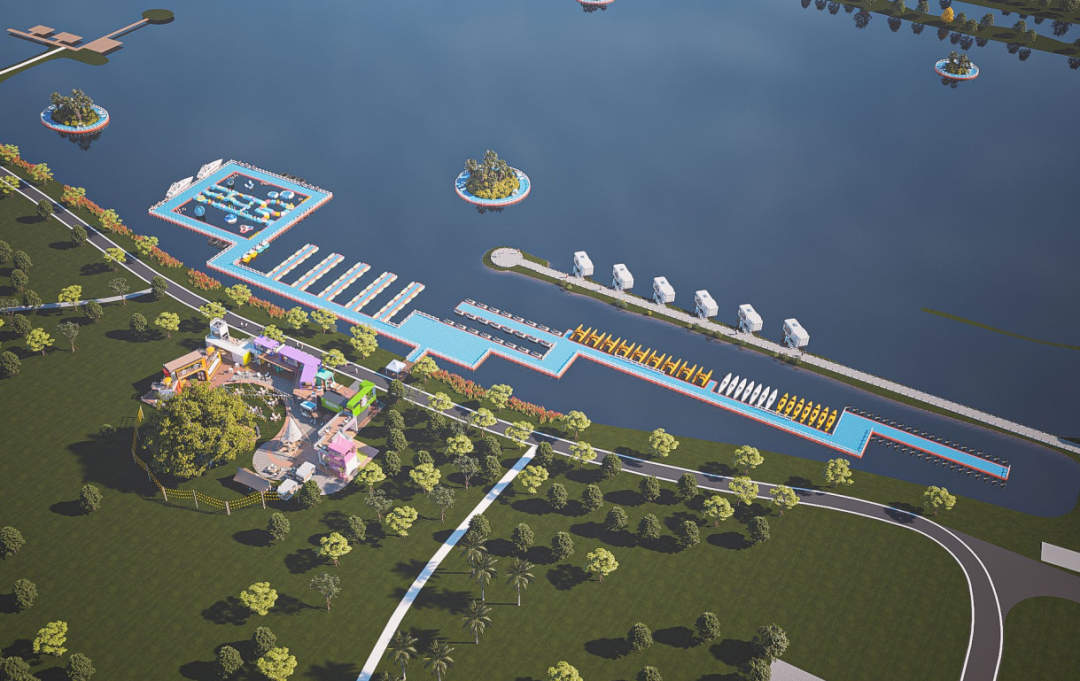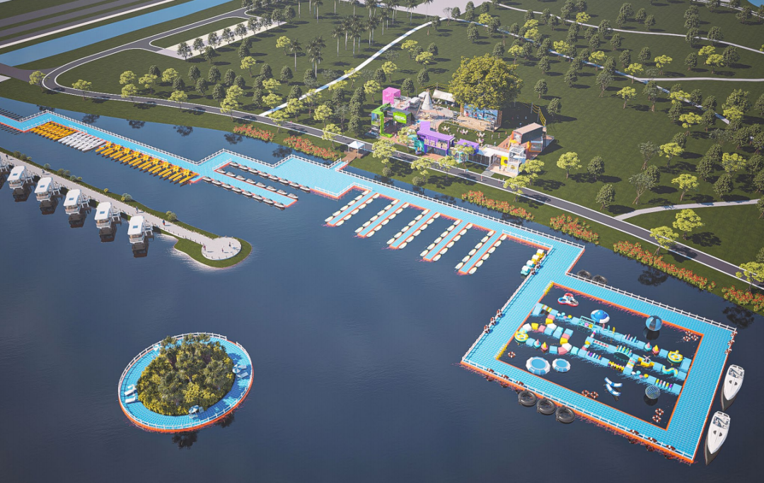 据了解,陆地市集搭配有户外影吧、水上运动俱乐部、餐饮小食、主题场景打卡点、音乐live等吃喝玩乐一站式的业态规划,丰富园区的整体功能活动体验感,打造面向全龄段水上主题嘉年华。金湖水上码头将打造珠海水上文化的新方向,包含水上无动力儿童空间、水上活动空间、椰林浮岛。游客可乘坐动力设施前往湖中各个岛屿打卡点,椰林浮岛将设置3米宽浮台,仿佛凌空浮于水上,让游客可在小岛上观赏湖上美丽风景、日落日出打卡拍照。