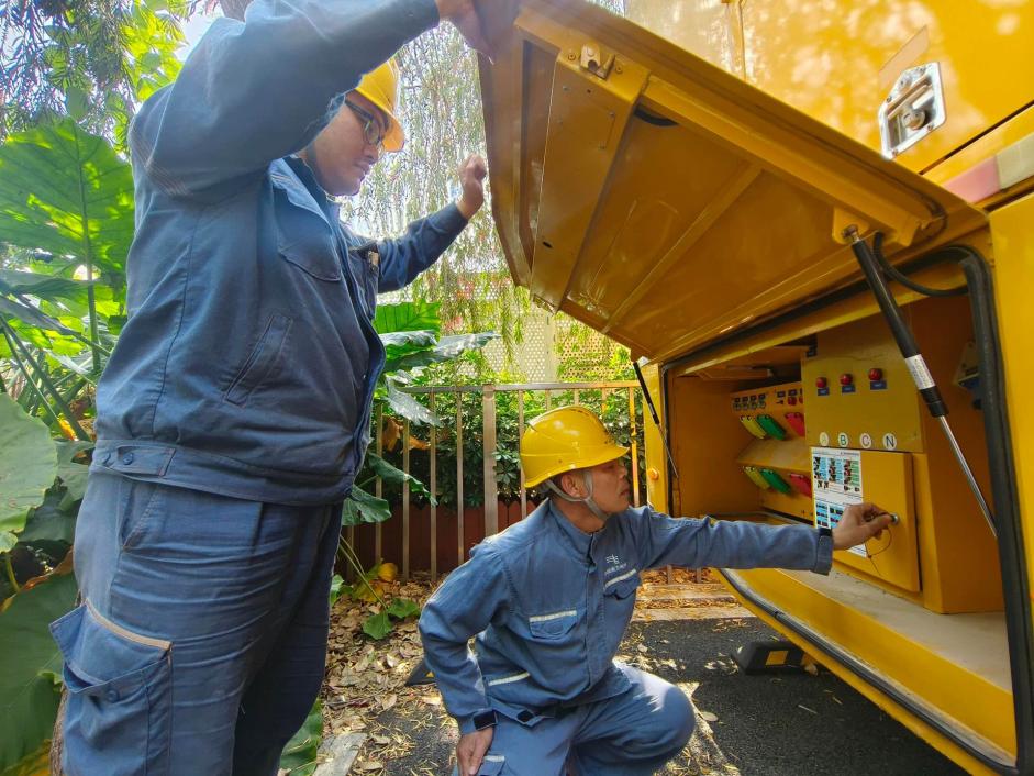 “大黄蜂”是应急抢修的得力设备,在台风到来前,珠海金湾供电局供电人员对应急发电车、照明应急设备进行检查和充电,力保台风登陆时,可供应急抢修使用。