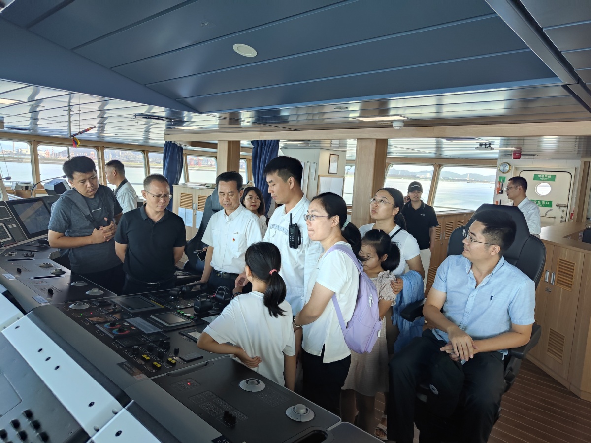 活动现场,“中山大学”号船长蓝明华对大家表示了热烈的欢迎,探测部主管曾信向大家介绍“中山大学”号船舶概况、建造历程、船上各类设备、船舶整体性能等基本情况。在大副李锋、三副刘家豪的带领下,大家先后参观了船舶的实验区、驾驶舱、生活区和甲板等区域,详细了解船载先进海洋调查大幅向仪器设备的相关知识。据介绍,“中山大学”号可针对海洋、大气、地质、生态环境等进行探测监测,能满足开展海洋工程与技术等多学科领域的科考研究,兼具强大的科考支持能力、先进的设备和配置。