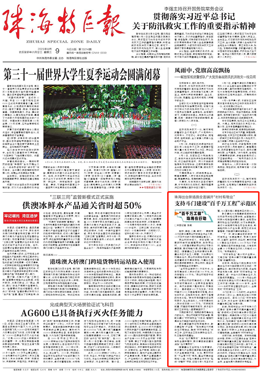此前,珠海市出台《关于支持斗门区建设“百县千镇万村高质量发展工程”促进城乡区域协调发展示范区的若干措施》,明确支持斗门区大力推进新型工业化、新型城镇化和农业农村现代化,加快建设“百县千镇万村高质量发展工程”促进城乡区域协调发展示范区,在绿色低碳发展、城乡规划建设、推进乡村振兴上走在全国前列。该措施明确,全面铺开“村村有物业”。