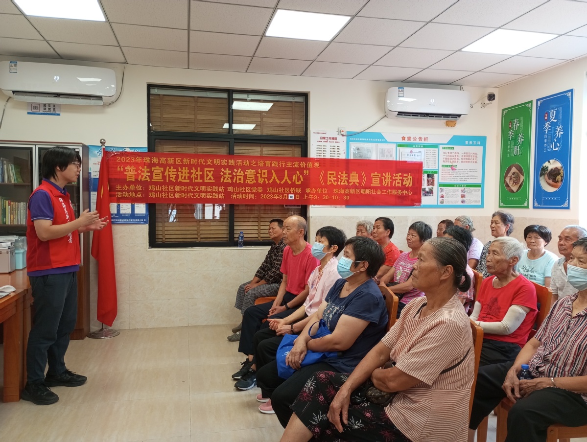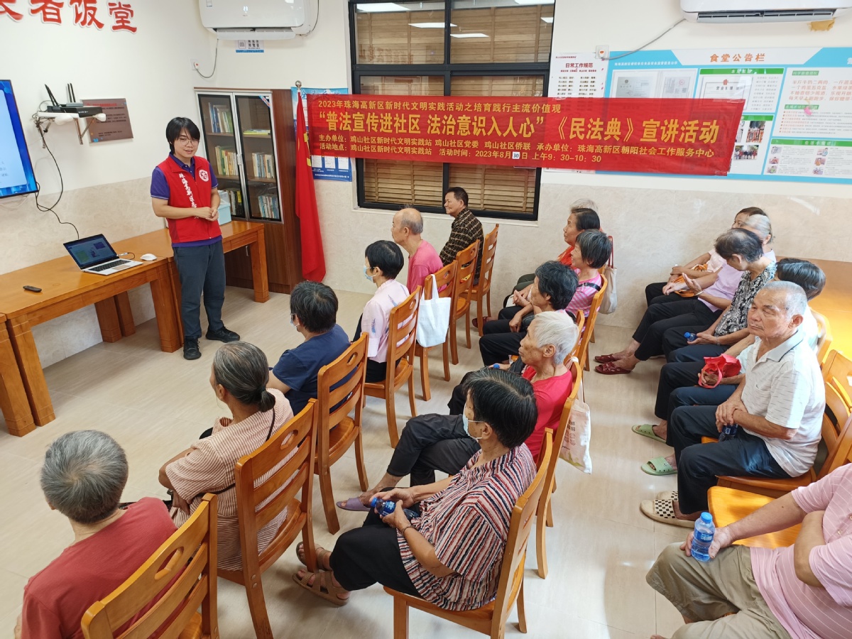 为进一步加大《民法典》宣传教育力度,提高广大群众的法律意识和法治观念。在唐家湾镇党委、鸡山社区党委、鸡山社区党群服务中心和社区新时代文明实践站的指导下,8月30日,唐家湾镇鸡山社区居家养老服务站开展了主题为“普法宣传进社区 法治意识入人心”的《民法典》宣讲活动,进一步提高长者们对《民法典》的认识,增强自我保护意识。