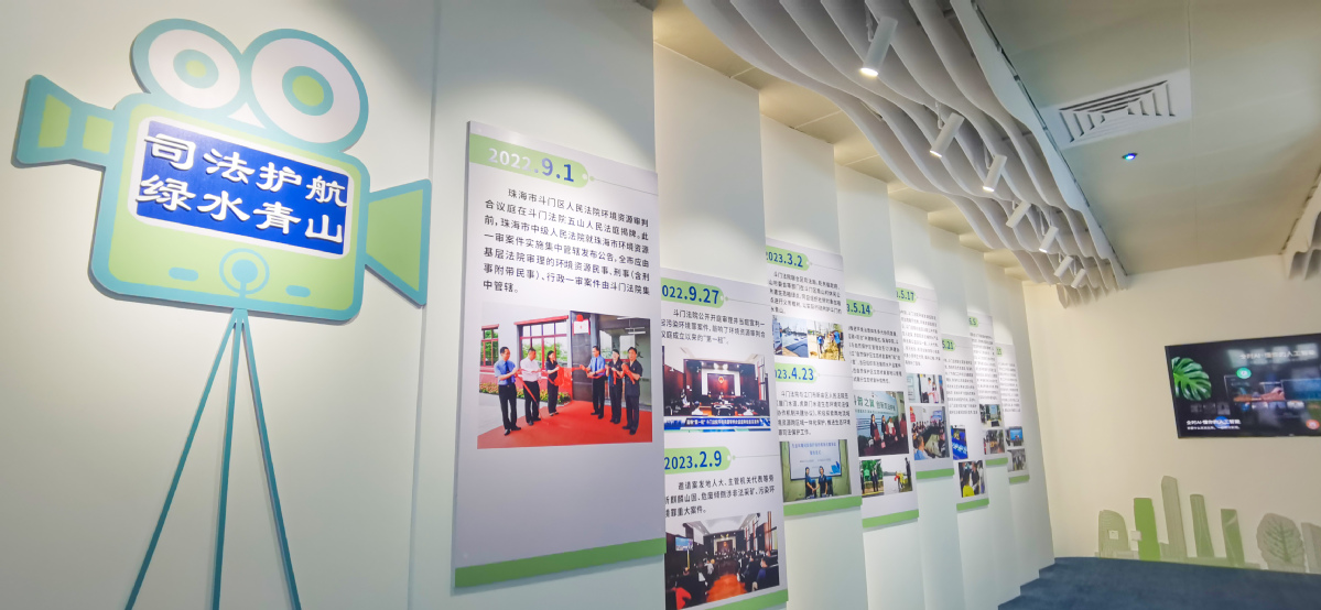 在斗门区人民法院环境资源审判合议庭成立一周年之际,位于五山人民法庭的“黄杨ZHENG绿美”生态文明展厅同步开放。