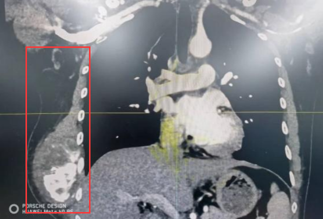 36岁的李先生(化名)半年前发现自己右侧胸部有个隆起的硬包,因没有明显不适就没有在意,但随着时间的推移,硬包越长越大,遂到中大五院胸外科就诊。完善相关检查发现为右侧胸壁软骨肉瘤,大小约16cm*12cm。