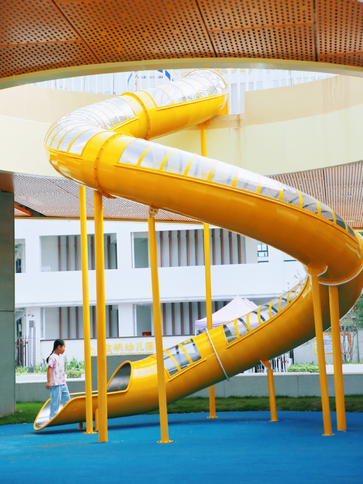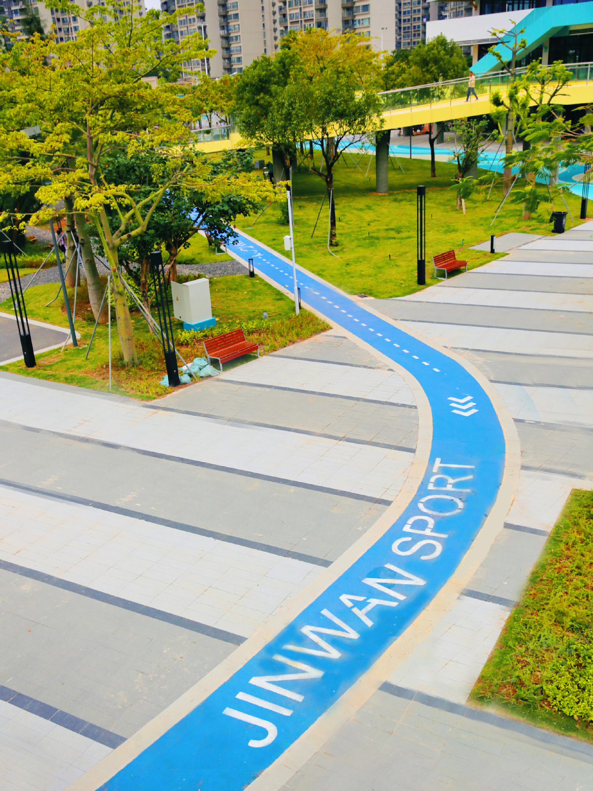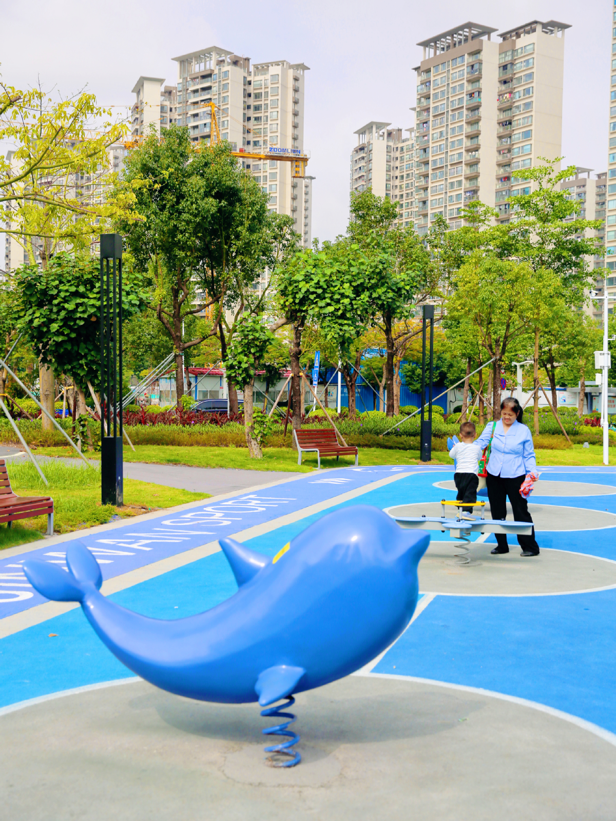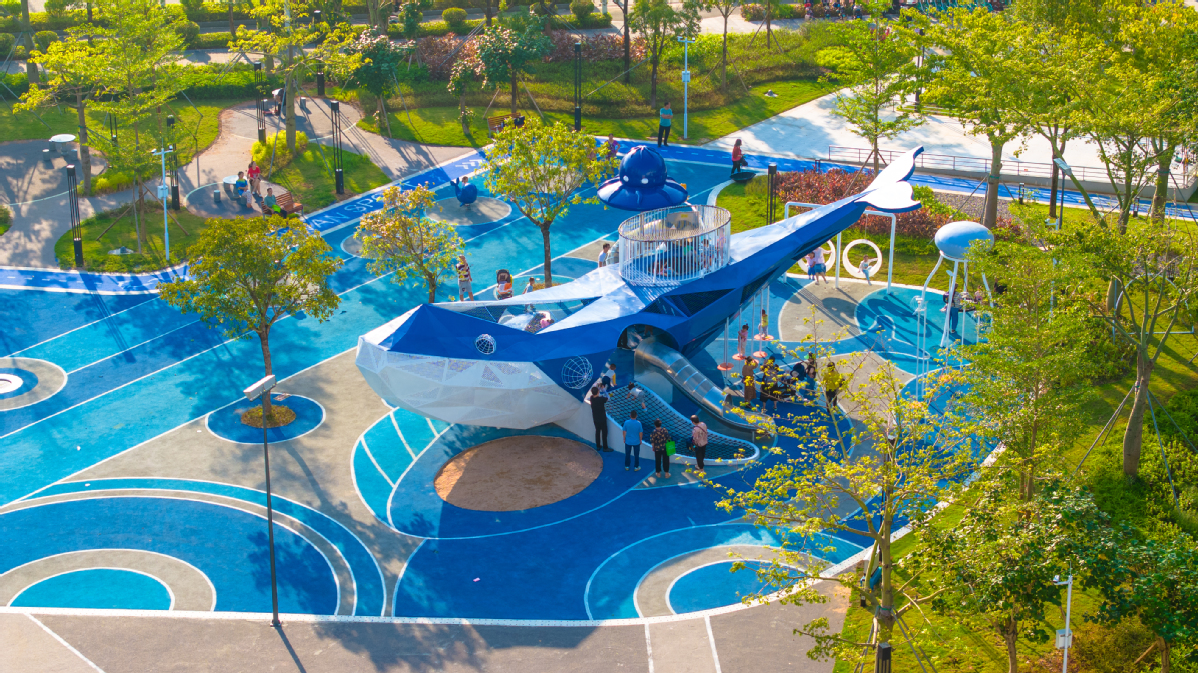 整个邻里汇由一座巨型连廊联通,连廊设置了旋转滑梯、户外座椅等设施,为市民打造了更多休憩空间。坐落于园区中央的街心公园用沥青步道打造了漫步系统,园区整体呈现海洋主题风格,不仅配有无动力儿童器械,还打造了阶梯式中央公园剧场。