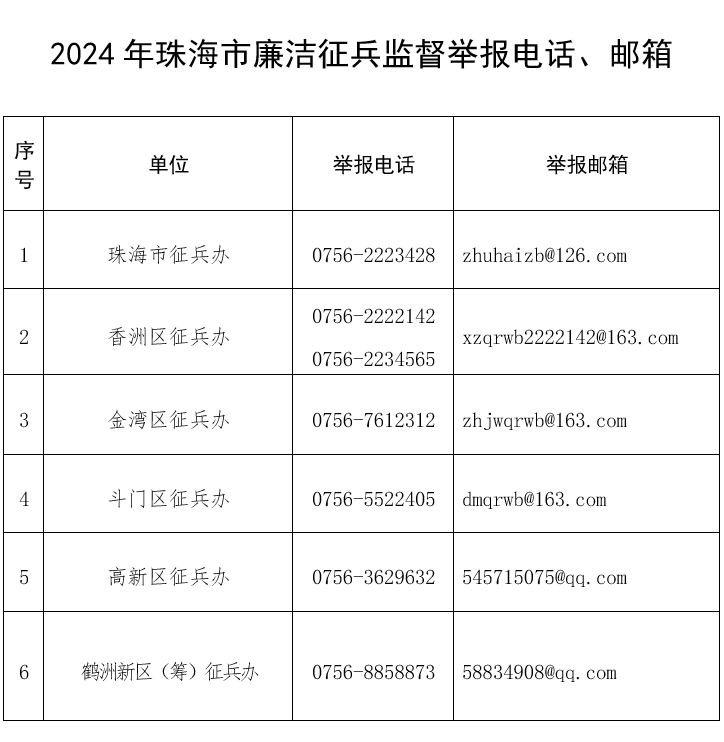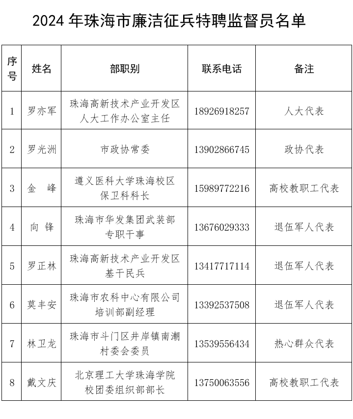 为深入贯彻党风廉政建设有关要求,有效维护广大应征青年的合法权益,增强征兵工作透明度,广泛接受群众监督,确保珠海市征兵工作公开透明。现将2024年珠海市人民政府征兵办公室廉洁征兵监督员,市、区两级监督举报电话和邮箱予以公布,欢迎社会各界对征兵工作进行监督。
