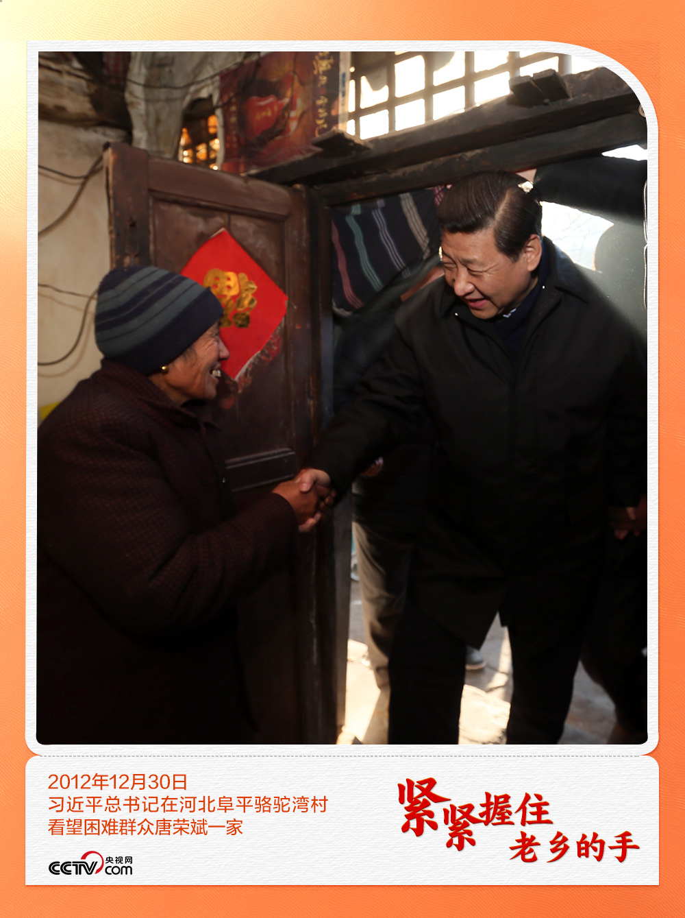 紧紧握住老乡的手,他问得仔细:“一年下来有多少收入,粮食够不够吃,过冬的棉被有没有?”