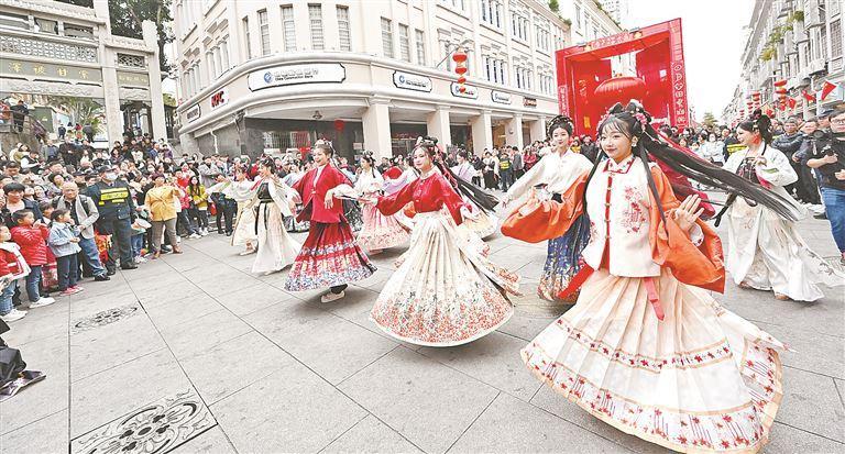 正月初七,“龙耀厦门·国潮迎新”2024春节厦门中山路汉服秀活动再度亮相。身着汉服的姑娘笑颜如花、翩翩起舞,古韵古风吸引路人驻足围观、拍手称好。