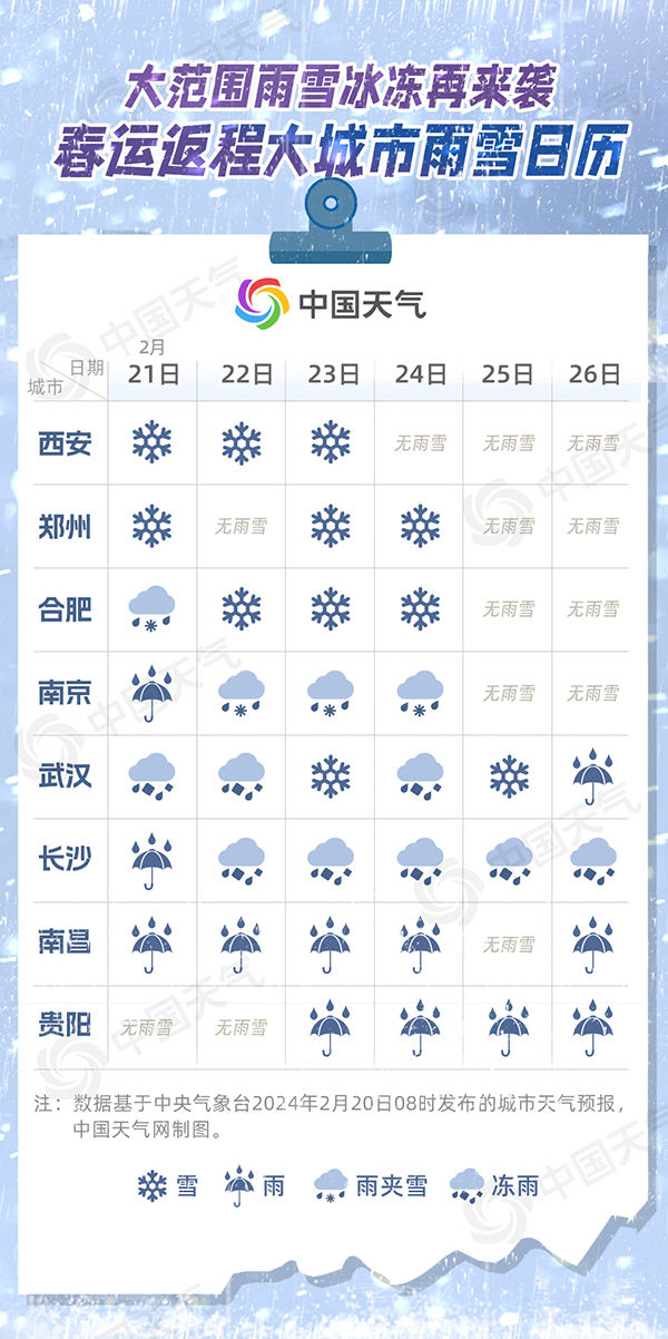 2月17日以来,龙年首场寒潮横扫我国大部,雨雪天气由西向东铺展。21日至22日,中东部将进入本轮雨雪冰冻过程的最强时段,河南、湖北等地降水相态复杂,雨、雪、冻雨并存。而23日前后,新一轮雨雪冰冻过程又将无缝衔接,湖北、湖南等部分地区冻雨或将持续4至6天。眼下正值春运返程,接连两轮雨雪冰冻将会对哪些地区的交通出行造成不利影响?中国天气网特别推出春运返程大城市雨雪日历,看何时何地影响最严重。