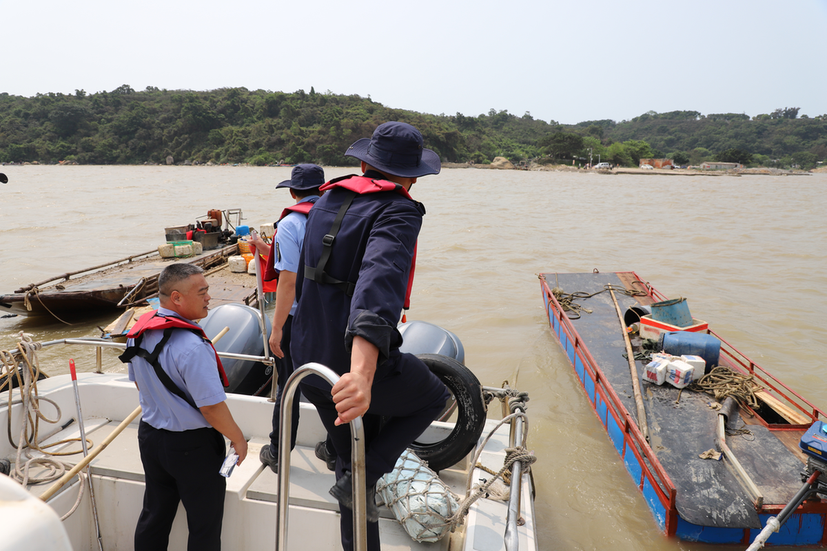 4月9日,支队所属高新大队出动执法工作人员13人、执法及辅助船4艘,在淇澳西南方向分两组展开行动,一组沿淇澳大桥往西北方向对网笼等非法渔业设施进行清理;另一组驾驶2艘辅助船沿红树林水道开展巡查,陆续将发现的涉渔“三无”船、泡沫筏拖出红树林外进行暂扣,共清理蚝排1处、网笼500余米,查扣涉渔“三无”船1艘、泡沫筏5个。