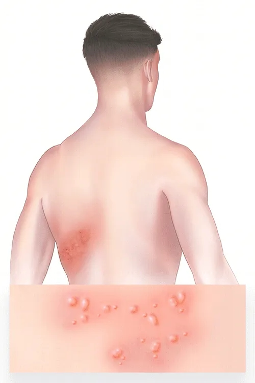 • 伴疼痛的成群水疱,单侧分布呈带状排列。