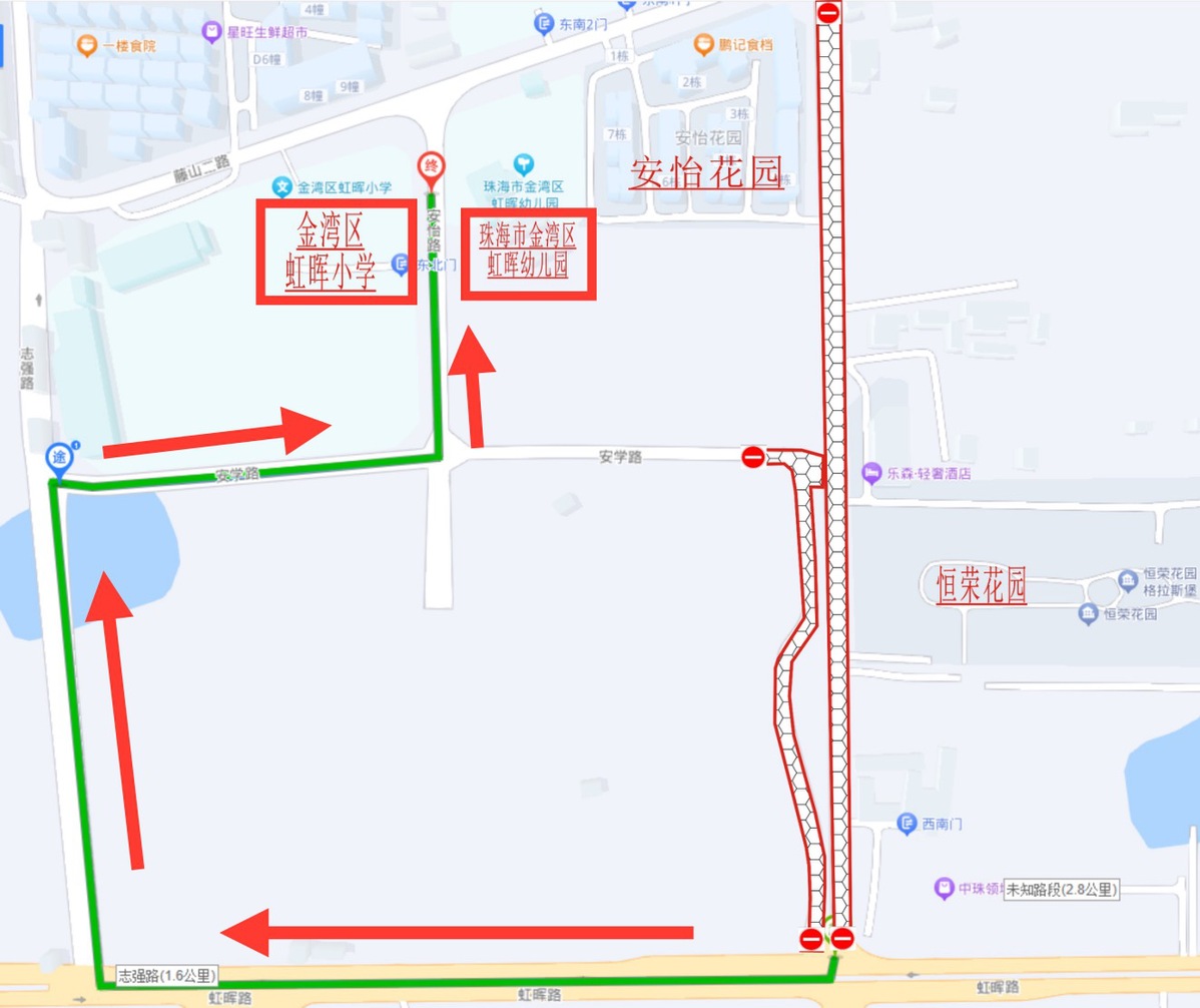 绕行方向:虹晖路红旗方向→(调头)虹晖路三板社区方向→志强路→安学路→安怡路→虹晖小学(虹晖幼儿园)