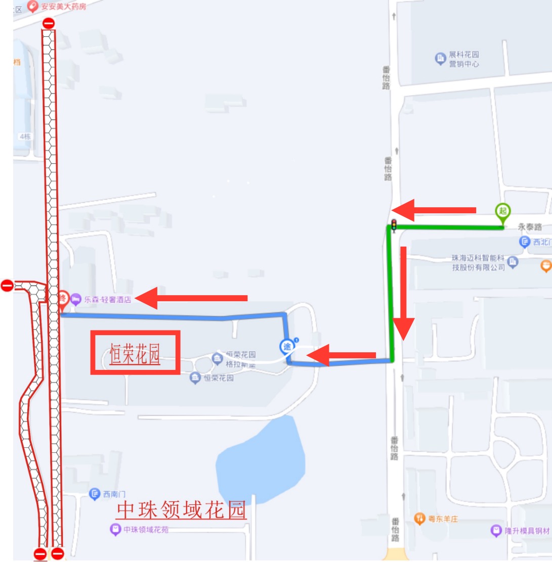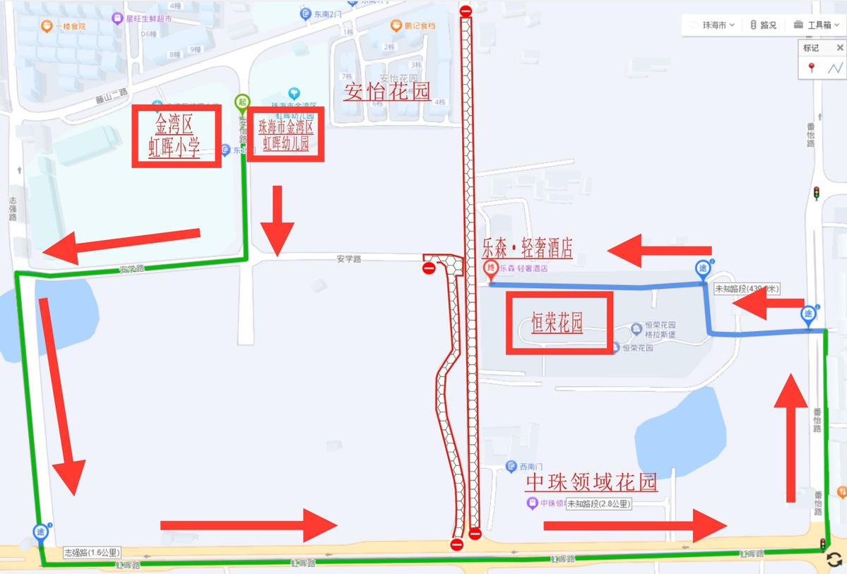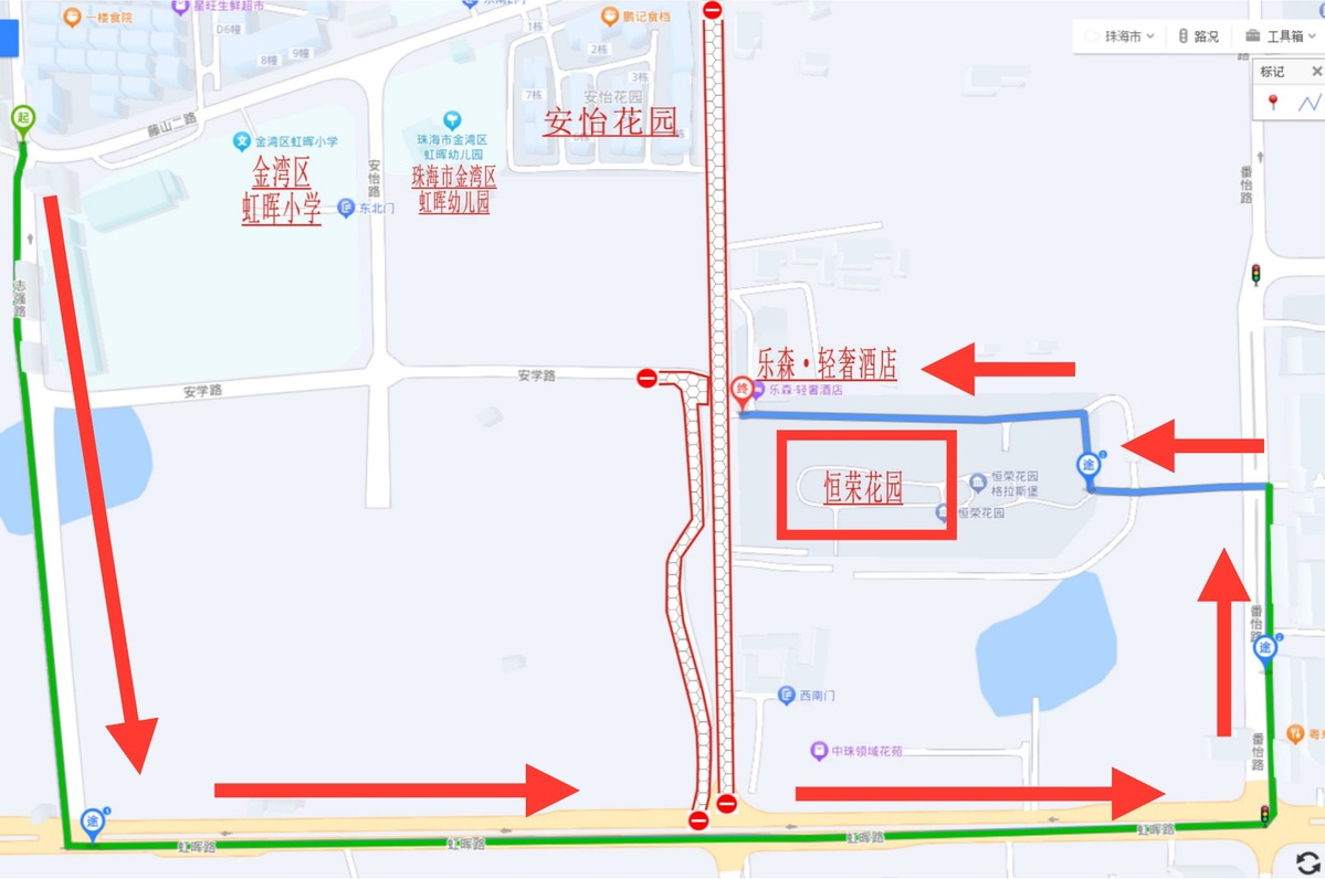 绕行路线:安怡路→安学路→志强路→虹晖路→番怡路→恒荣花园(小区东门)